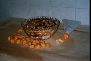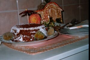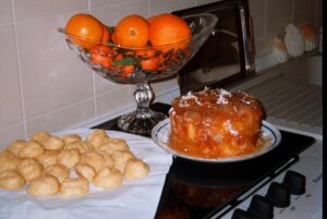 Febbraio 2, 2012 RICETTE DI CUCINA articoli 400 admin ALCUNE RICETTE DI CASA MIA DODICESIMA PARTE 02/02/201 IN CUCINA CON FEDERICA seconda parte FEDERICA sono proprio curiosa di vedere come utilizzerai l’ultima parte del pan di spagna. ELENA Anch’io! No, sto scherzando questa torta l’ho già rifatta mille volte; ora te la presento: DOLCE TARTUFATO AI FIORI Ingredienti : pan di spagna soffice al cioccolato alto circa due cent., dal diametro di ventidue. Trecento grammi di cioccolato fondente, duecentocinquanta grammi di panna fresca, trenta grammi di zucchero, trenta grammi di cacao amaro, trenta grammi di zucchero a velo vanigliato, venti grammi di burro fresco, due banane, liquore Orange, filini di scorza di mandarino caramellati, mezzo cucchiaino di fecola, caffè al ginseng. Esecuzione: intanto prepariamo una teglia apribile, la stessa dove abbiamo fatto il pan di spagna. In una casseruola mescoliamo lo zucchero con centocinquanta grammi di panna, aggiungeremo il burro, togliamo dal fuoco e mettiamo il cioccolato a pezzi, dopo averlo sciolto aggiungere mezzo bicchierino di liquore, se dovesse risultare troppo denso aggiungere un po’ di latte. Ora mettiamo il composto ottenuto nella teglia foderata con carta da forno, lo lasciamo raffreddare e lo metteremo in frigorifero per venti ore. Adesso bagniamo il pan di spagna con caffè al ginseng, abbiamo già tagliato a rondelle le banane, messe nel liquore con lo zucchero a velo. Togliamo dal frigorifero il composto al cioccolato, lo capovolgiamo sopra il pan di spagna e mescoliamo il cacao amaro con un cucchiaio di zucchero a velo, lo distribuiremo per tutto il dolce usando un setaccino. Formiamo una cremina con il liquore, un po’ di fecola, e lo zucchero a velo (un bicchierino circa). Ora faremo la guarnizione mettendo tutt’intorno al dolce le rondelle di banane, per ogni rondella faremo dei petali con i filini caramellati del mandarino, infine prendiamo la rimanente panna, la montiamo con lo zucchero vanigliato e con il sacco per guarnizioni faremo gli steli dei fiori e sempre con la panna montata guarniremo il centro della torta; versiamo la cremina di liquore alla base del dolce. Et voilà so per certo che dopo avere riposato un’ora nel frigorifero la torta andrà a ruba! Vino ideale : un passito oppure un moscato siciliano. Federica – Ne prenderei una fetta! Davvero, ora non saprei quale scegliere per festeggiare il quattordici febbraio! ELENA Ancora non hai visto niente! Ti troverai a realizzare torte a cinque, a dieci piani! Alla prossima… …………………………………………………………………………………………………………… 04/02/2012 ELENA Oggi voglio presentarti il ” Cuore di S Valentino “, occorrono ingredienti freschi: come i savoiardi fatti in casa, lamponi e una teglia apribile a forma di cuore. FEDERICA Non vedo l’ora di iniziare! Sai? Mi sono procurata delle piccole teglie per fare le prove dei tuoi dolci, oggi cercherò anche la forma di cuore e magari anche altri stampi. ELENA Che voto ti sei data? Sono riuscite bene? FEDERICA Sì, Mi darei un sei più, per non esagerare. ELENA Il tuo sei è un mio otto, perché so che ci metti il cuore. Quella che ti presento ora sarà l’ultima ricetta dolce prima di S. Valentino, così avrai modo di provare e riprovare fino alla perfezione. CUORE RIPIENO AI LAMPONI Ingredienti: savoiardi freschi appena sfornati, duecento grammi di lamponi, amaretti, tre uova, farina “00” oppure fecola, trecentocinquanta grammi di cioccolato fondente, zucchero a velo vanigliato, latte, alchermes,cacao amaro, zucchero semolato, panna montata. Esecuzione: rivestiamo il fondo dello stampo con la carta da forno. Dopo aver lavato i lamponi li stenderemo sopra alla carta assorbente, metà li passiamo al setaccio, l’altra metà servirà per guarnire il cuore. Mettiamo a sciogliere a bagno maria duecentocinquanta g. di cioccolato fondente con il latte anche questo servirà per rivestire il dolce. Ora sbattiamo i tuorli con lo zucchero, aggiungeremo la farina o fecola, sempre mescolando metteremo il latte, un cucchiaio di amaretto, andrà addensato a bagno maria; con lo stesso procedimento faremo la crema al cioccolato usando il cacao, lo zucchero, e il rimanente cioccolato tagliato a pezzetti. Adesso che abbiamo davanti tutti gli ingredienti prendiamo la teglia, sul fondo stenderemo un velo sottile di cioccolato fuso (il primo che abbiamo cucinato) quindi copriamo il fondo con i savoiardi imbevuti nell’alchermes, copriamo con la crema, sbriciolare gli amaretti e faremo un altro strato di savoiardi imbevuti nel succo di lamponi, poi, via con la seconda crema al cioccolato, copriamo con i savoiardi, un velo di panna montata con lo zucchero vanigliato, e così via…Ora, rivestiamo il nostro dolce con il cioccolato fuso, assicuriamoci di rivestire anche i bordi; mettiamo i lamponi a corona e guarniremo con la panna montata. Lasciamolo riposare on’oretta circa e sarà pronto per la festa. Ora voglio mostrarti questa foto: si tratta della ” Torta ai bignè ” , la ricetta la potrai trovare nell’articolo: Alcune ricette…nona parte. Che ne dici? TORTA AI BIGNÈ …………………………………………………………………………………………………………… 07/02/2012 ELENA Oggi vorrei mostrarti un menù completo: un primo, un secondo e anche se ti avevo detto che non ti avrei più mostrato dei dolci prima della festa, ora ho cambiato idea perché questo si accompagna con le pietanze che ora ti cucinerò. FEDERICA La cucina mi appassiona sempre di più! Domenica ho realizzato l’ultimo dolce che mi hai consigliato; ho fatto anche i savoiardi freschi, ho trovato delle formine piccole ed è riuscito discretamente: anzi, Alessandro credeva che l’avessi acquistato in pasticceria. ELENA Questo non può che rendermi orgogliosa. Ora ti detterò le ricette: faremo un primo gustoso ma delicato, sono degli gnocchetti picc