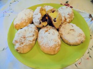Settembre 1, 2022 RICETTE DI CUCINA articoli 400 admin LE RICETTE DI CASA MIA TRECENTOQUARANTASEIESIMA PARTE 01/09/2022 IN CUCINA CON AMORE E CON FEDERICA Ed eccoci al nuovo appuntamento di Settembre. Avete passato bene le vacanze? Spero proprio di sì, siamo tutti in ansia per tutte le cose che sono ancora campate in aria, speriamo bene! Ho visto molti volti preoccupati per la nostra attuale situazione, ma ho fiducia nella competenza di qualcuno, in qualche modo ne usciremo, anche se ci vorrebbe un miracolo! Bisogna crederci. Ho una bella novità da raccontarvi: ho contattato persone di cui ho sempre avuto grande fiducia e rispetto, e mi hanno dato il permesso di scrivere la loro storia. Una storia vera, raccapricciante, ma ha dei risvolti positivi meravigliosi che fanno di loro persone vere e di sani principi incredibili. Oggi incominciamo subito con la ricetta del giorno, voglio incominciare l’articolo con un dolce rivisitato: si tratta della torta delle rose alla crema, una delizia per grandi e piccini. TORTA DELLE ROSE ALLA CREMA Ingredienti: 100 g di burro, 100 g di zucchero, 70 g di lievito di birra, 900 g di farina tipo “00” 4 uova e un rosso, un bicchiere di latte, estratto di vaniglia, la buccia di un limone intero grattugiata. Ingredienti per la crema al rum: 100 g di burro, 150 g di zucchero a velo, mezzo bicchiere di rum per dolci. Per la crema pasticciera: un litro di latte, scorze di limone e arancia, 5 cucchiai di zucchero, sei cucchiai di amido di mais e tre tuorli. Questa torta di solito la facevo con il lievito madre, ma siccome molte di voi mi hanno detto che con il lievito madre non si trovano bene, allora ho fatto questa con il lievito di birra. Esecuzione: sciogliamo il lievito nel latte, aggiungiamo lo zucchero, il burro, la vaniglia, la buccia di limone grattugiata e la farina. Mescoliamo, amalgamiamo bene l’impasto e lasciamo riposare per un’ora a temperatura ambiente. Intanto faremo le due creme: incominciamo con la crema al rum amalgamando i tre ingredienti e cioè il burro, lo zucchero a velo e il rum ottenendo una bella cremina. Poi facciamo subito la crema pasticciera sbattendo le uova con lo zucchero, le bucce di agrumi grattugiate, i sei cucchiai di amido di mais e il latte, ( teniamone da parte un bicchiere, in caso la crema dovesse risultare troppo densa allora l’aggiungeremo alla fine) . Adesso prendiamo l’impasto e lo tiriamo con il mattarello a uno spessore di un cm e mezzo, che andremo a spennellare la superficie con la cremina al rum. Dopo di che spalmeremo metà della crema pasticciera su tutta la superficie lasciando liberi i bordi, faremo un rotolo e ne ricaveremo sei o sette pezzi di uguale misura che andremo a metterli nella teglia foderata di carta da forno unta di burro; sistemiamo i rotoli in maniera verticale e tutti uniti fra loro. Adesso lasciamo lievitare un’altra ora e poi la metteremo in forno a 180° per quaranta minuti e forse un po’ di più. Servire la torta con altra crema pasticciera o gelato. Eccola! Federica l’ho assaggiata, è una cosa divina! Grazie! Elena Arrivederci a domani con un’altra ricetta e altri articoli. 02/09/2022 Elena Un piatto di pesce? L’ho fatto con molta cura anche se in realtà al solo pensiero che venga dal mare si arriccia un po’ il naso. Ho cucinato dei filetti di cernia pastellati al forno, l’ho assaggiato, ed era davvero squisito. FILETTI DI CERNIA AL FORNO Ingredienti: filetti di cernia, succo di agrumi misti, panco, latte, sale, pepe, salvia, rosmarino, porro, uno spicchio di aglio indivia, fave, olio extra vergine d’oliva gentile, origano. Esecuzione: mettiamo i filetti di cernia a marinare nel succo di agrumi, sale, pepe, rosmarino, porro tritati, li lasciamo marinare per tre ore e poi li passeremo nel latte, nel panco, un’altra volta nel latte e ancora nel panco; li stenderemo in una teglia da forno sopra la carta spennellata di olio, poi passiamo sopra i filetti un giro di olio e lasciamo cuocere in forno preriscaldato a 180° per 15 minuti circa. Nel frattempo faremo la crema di scarola e fave: facciamo cuocere le fave, le mettiamo nel mixer insieme ad un po’ di olio, sale, pepe, uno spicchio di aglio nuovo e la scarola. Quando la crema sarà pronta la verseremo nel piatto di portata e ci adageremo il pesce. Federica Questa ricetta è molto raffinata. Elena Grazie, a domani. 03/09/2022 Elena Oggi invece facciamo un buon risotto, un risotto nutriente, saporito senza ragù di carne o di pesce, all’uva moscato bianco e legumi. RISOTTO ALL’UVA MOSCATO BIANCO E LEGUMI Ingredienti: riso 300 g, mezzo porro, un grappolo di uva moscato bianco (300g circa) trecento g di piselli e ceci, sale, pepe, brandy, parmigiano grattugiato, olio extra vergine d’oliva gentile, burro, salvia due rametti di erba ruta. Esecuzione: tagliamo il porro a rondelle sottili, lo mettiamo a rosolare insieme al riso. Poi sfumiamo il tutto con mezzo bicchierino di brandy, aggiungiamo l’acqua dove abbiamo cotto i legumi e lo portiamo a metà cottura. Intanto schiacciamo l’uva, e frulliamo i legumi con olio, sale e pepe; aggiungiamo la crema di legumi al riso e dopo alcuni secondi incorporiamo il succo di uva e le foglioline di ruta. A fine cottura lo mantechiamo con un po’ di burro, una foglia di alloro, salvia infine aggiungeremo il parmigiano e il risotto è pronto da servire. Federica Dovrebbe essere squisitissimo! 04/09/2022 Elena Oggi voglio presentarvi le mie polpette di pomodori e legumi, molto buone perché piacciono anche ai bambini. POLPETTE DI LEGUMI E POMODORI Ingredienti: pomodori maturi e carnosi, fagioli borlotti, piselli o fave, un porro, basilico, prezzemolo, origano, alloro, rosmarino, salvia, sale, pepe, cubotti di provola, parmigiano, pangrattato, olio extra vergine d’oliva, rosmarino. Esecuzione: tagliamo i pomodori a pezzetti, li lasciamo scolare dal loro liquido, e nel frattempo cuoceremo i legumi. Prepariamo tutti gli ingredienti sul piano di lavoro e incomincia