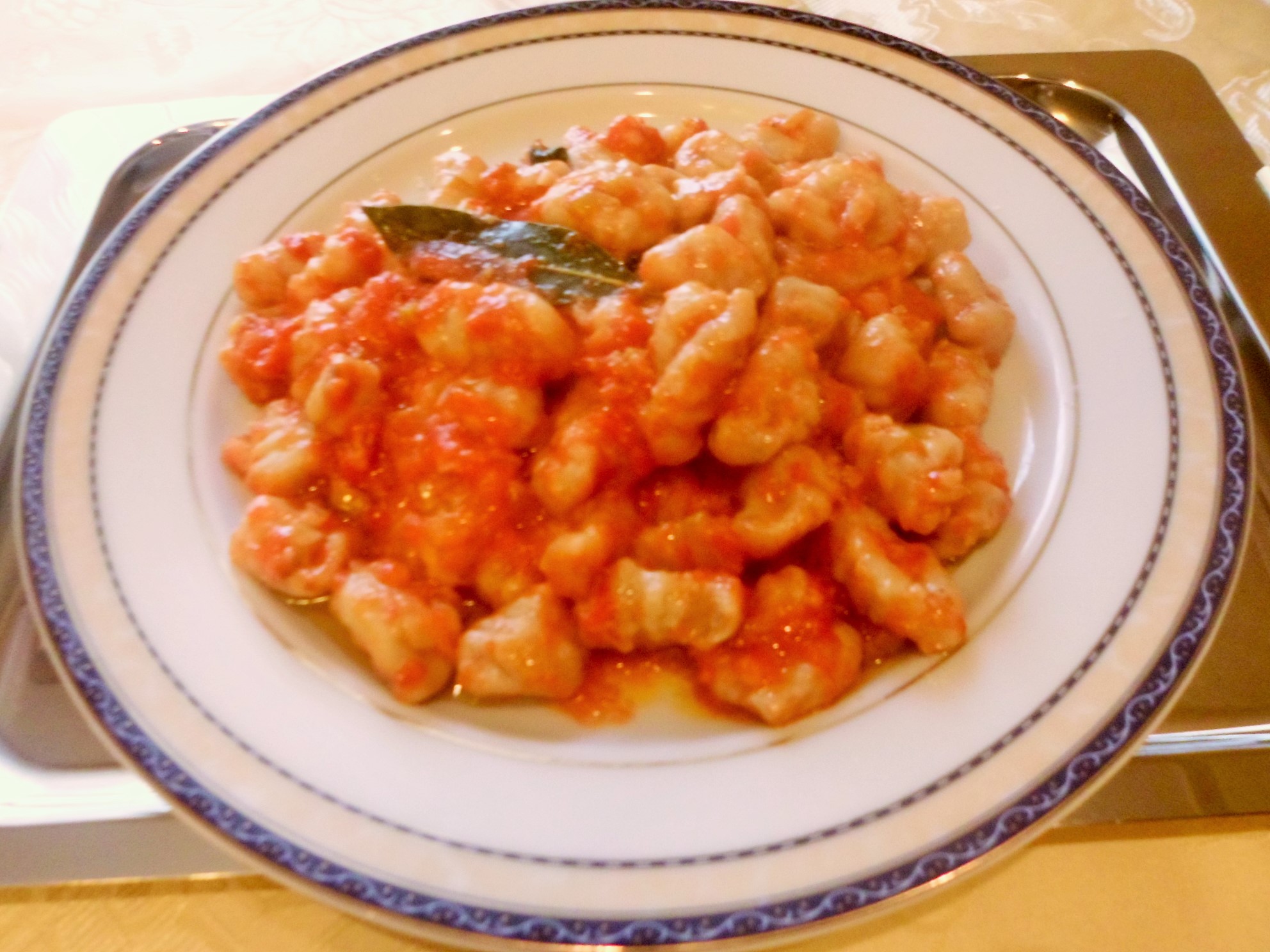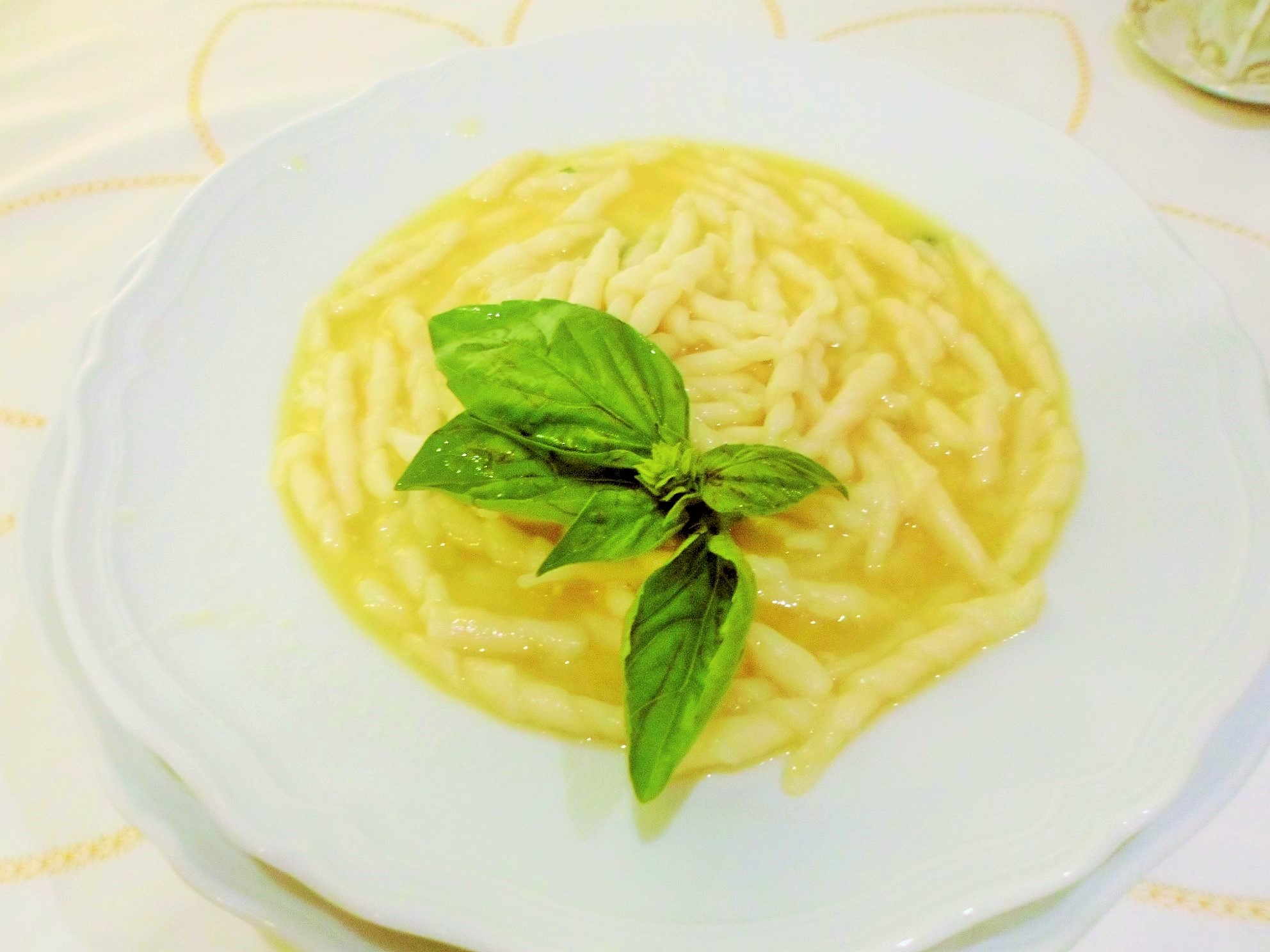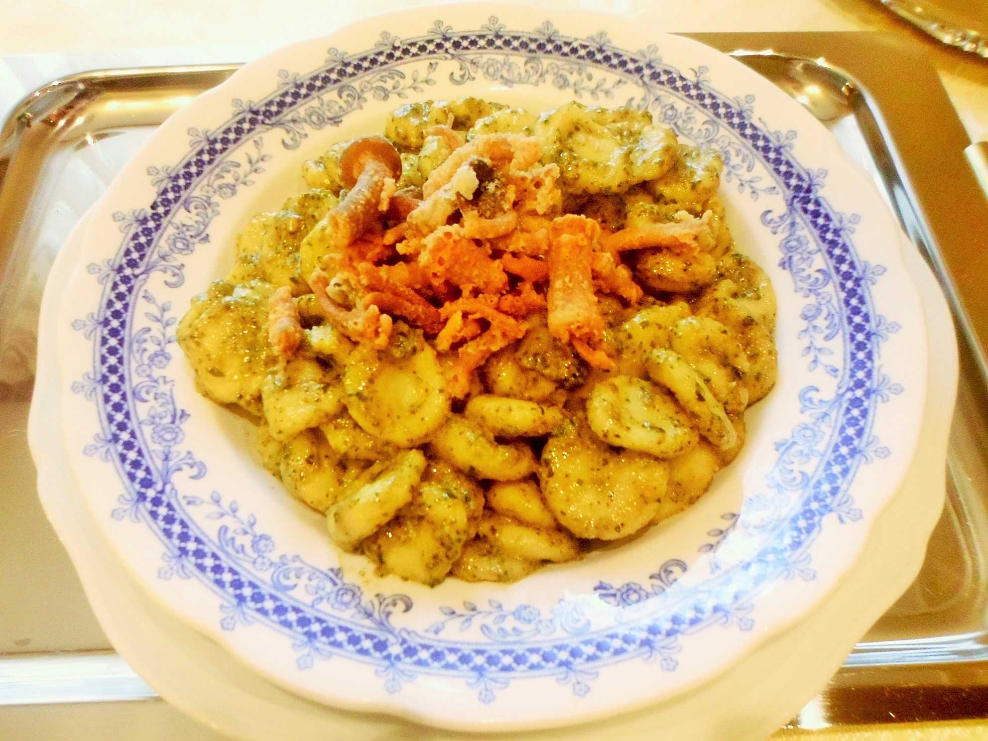 Ingredienti per le orecchiette:  50% di patate e semola,  un uovo.  Per il pesto: 20% di rughetta selvatica,  30% di estragone,  20% di borragine,  e 30% di riccione (radicchio di campo coltivato),  parmigiano,  sale,  pepe,  scalogno,  una punta di peperoncino,   40% di semi di zucca tostati,  e olio extra vergine d’oliva.  Per decorare il iatto:  funghi pioppini fritti (insieme sono squisiti).