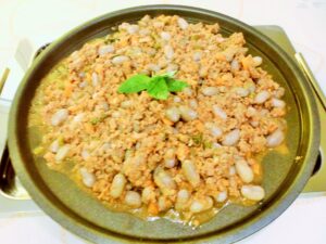 Ingredienti:  fagioli q.b.,  carne macinata di vitello, o vitellone o maiale.  Sale,  pepe, aglio,  scalogni,  due pomodori maturi,  sedano,  carote,  finocchietto selvatico,  basilico,  olio extra vergine d0oliva,  brodo,  una crosta di parmigiano,  mezzo bicchiere di vino bianco.