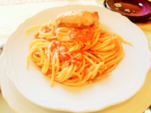 Ingredienti:  spaghetti,  salmone,  pomodori freschi,  acciughe sotto sale,  origano,   aglio,  tropea,  basilico,  sale,  pepe,  paprica dolce,  olio extra vergine d’oliva gentile un bicchierino di marsala,  un pizzico di peperoncino,  parmigiano grattugiato.