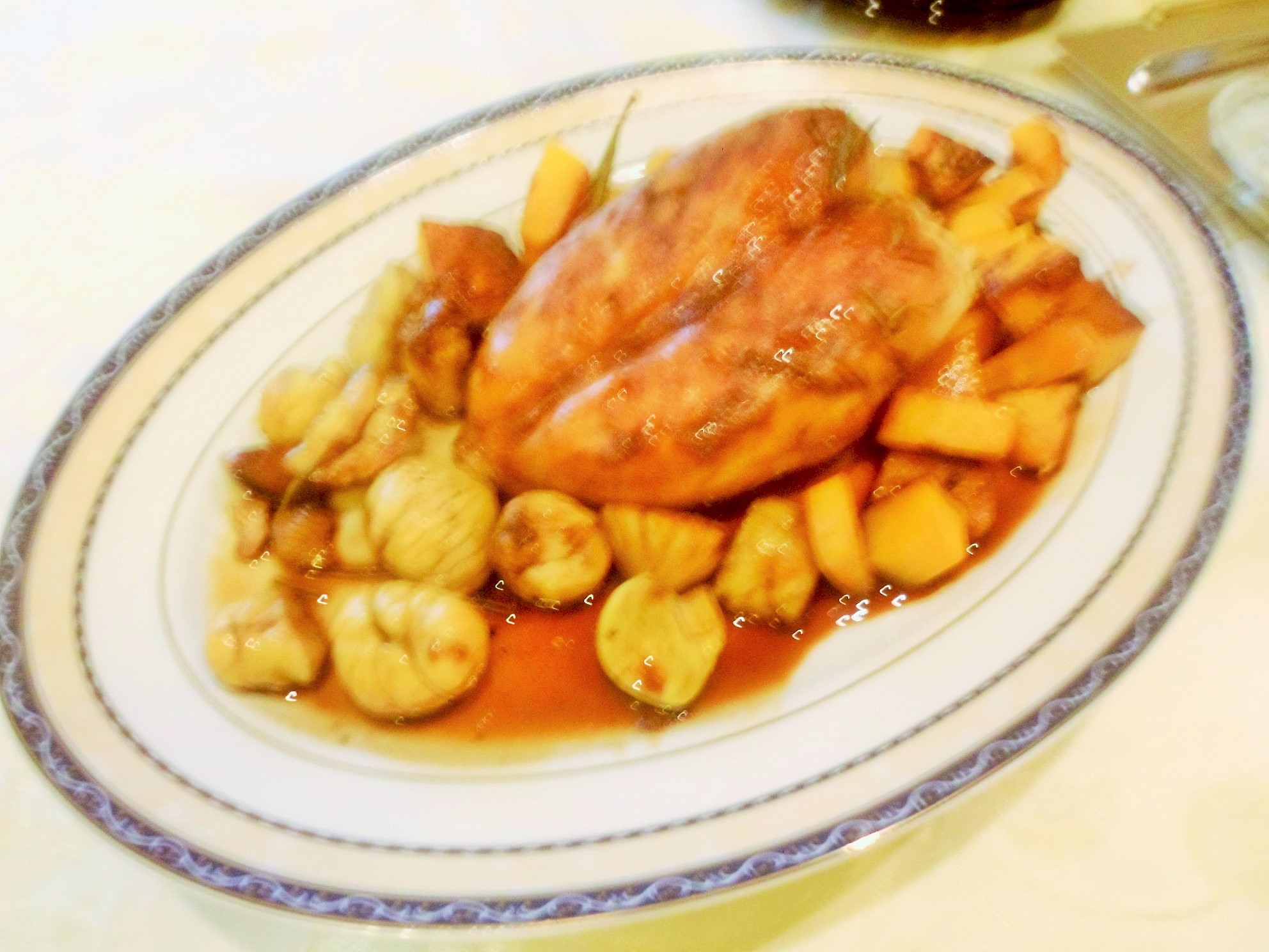 Ingredienti:  cappone,  le parti che volete:  petto o e sovracosce ecc.  castagne, zucca,  olio extra vergine d’oliva gentile,  aceto balsamico,  pepe,  sale,  brodo di carne,  bacche di ginepro, due chiodi di garofano,  noce moscata,  aglio,  rosmarino,  citronette.