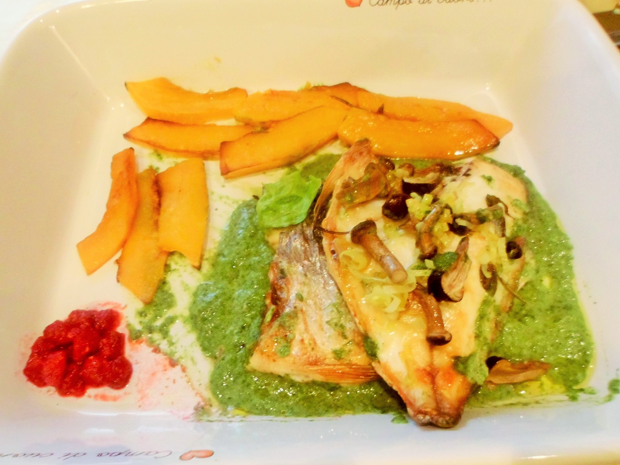 Ingredienti:  filetti di orata,  scarola,  taleggio,  funghi pioppini,  lamponi in agrodolce,  zucca,  olio extra vergine d’oliva,  rosmarino,  succo di agrumi,  sale,  pepe.