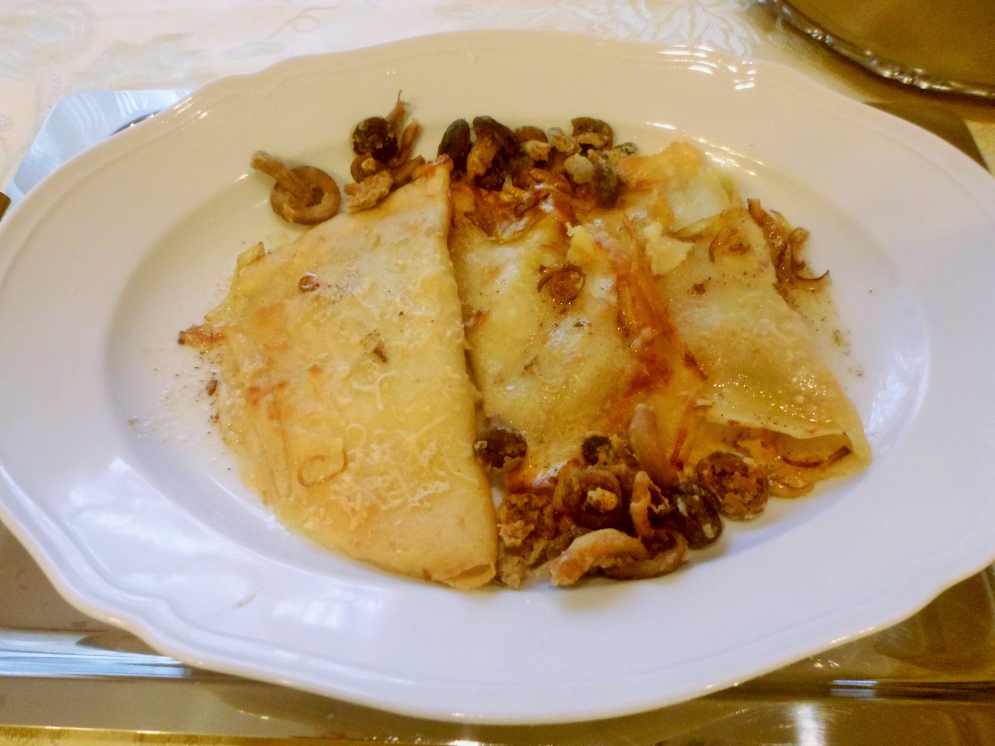 Ingredienti per le crespelle:  due uova,  succo e buccia grattugiata di mezzo limone, un bicchiere di latte,  noce moscata,  sale,  pepe,  farina “00” fino a quando il composto scorrerà bene dal cucchiaio;  una noce di burro,  farina ,  olio di arachidi .  per il ripieno: funghi porcini trifolati,  prezzemolo,  funghi pioppini fritti,  parmigiano, stracotto di manzo tritato finemente, tre cucchiai di panco,  porro olio extra vergine d’oliva gentile.  Per il condimento:  burro,  alloro, parmigiano grattugiato,  brodo.