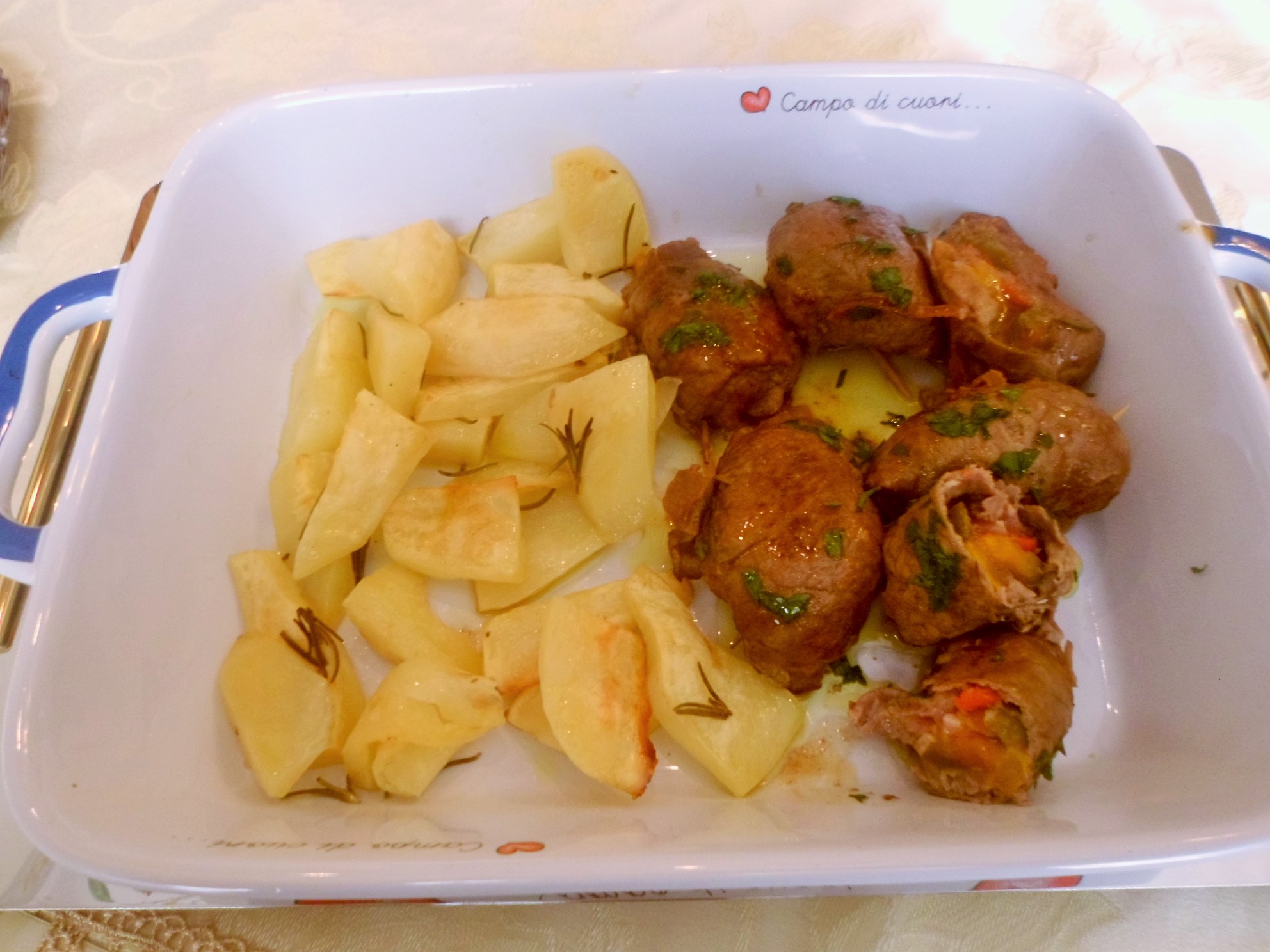 Esecuzione:  rosoliamo le verdure fatte  prima a piccoli pezzi,  sfumiamo col vino,  saliamo,  pepiamo e mettiamo una grattata di cren,  lasciamo appassire poi aggiungeremo i formaggi e riempiamo le fettine di vitello messe a marinare la sera prima nel succo di agrumi, sale,  alloro,  salvia e rosmarino.  Formiamo gli involtini,  li rosoliamo con olio una spruzzata di brodo; lasciamo cuocere per 10 minuti a fiamma moderata.  Nel frattempo peliamo e tagliamo le patate,  le passiamo in padella con un filo di olio e rosmarino,  poi le metteremo nella teglia in forno a 180° per 15 minuti;  dopo di che aggiungeremo anche gli involtini e li lasceremo dorare per altri cinque minuti insieme alle patate.