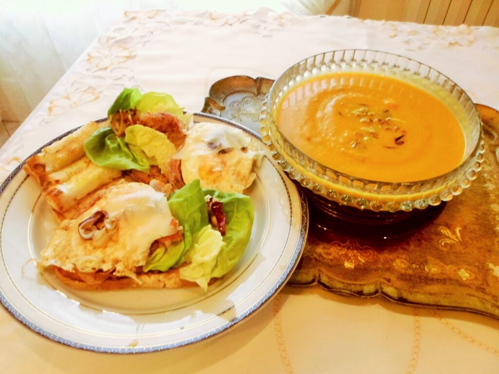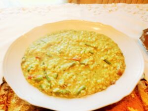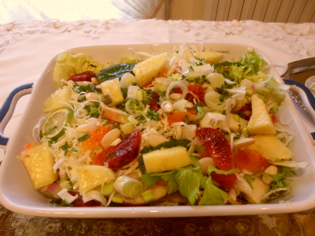 Aprile 19, 2021 RICETTE DI CUCINA articoli 400 admin LE RICETTE DI CASA MIA TRECENTESIMO ARTICOLO 19/04/2021 IN CUCINA CON AMORE E CON FEDERICA Elena La ricetta di oggi è una buona minestra di riso, fatta con amore pensando ai miei genitori e ai miei nonni; in primavera si faceva spesso. MINESTRA DI RISO Ingredienti: riso per minestre, sale, pepe, spezie miste, erbette, asparagi, coppa, parmigiano, burro, brodo di carne, chiodo di garofano, latte, scalogno, porro, olio extra vergine d’oliva, vino bianco. Esecuzione: puliamo gli asparagi e le erbette, sbollentiamole verdure, poi gli asparagi li spezzettiamo tenendo soltanto la parte tenera, le erbette invece le faremo trifolate con latte, chiodo di garofano e parmigiano. Adesso facciamo un soffritto di scalogno e porro con un po’ di olio extra vergine d’oliva, poi grigliamo la coppa e la tagliamo a listarelle o a dadini. Adesso facciamo arrostire un po’ il riso, poi sfumiamo col vino, e aggiungiamo il brodo necessario per la cottura, lasciamo cuocere a calore medio con il coperchio messo a metà casseruola. A cottura al dente, incorporiamo gli asparagi, un po’ di spezie, e le erbette passate al mixer, mantechiamo e a fuoco spento mettiamo il burro, i dadini di coppa e il parmigiano grattugiato, aggiustiamo di sale e o pepe e il piatto è pronto da servire. Federica Questo piatto sicuramente piacerà anche ai bambini. 20/04/2021 Elena Oggi invece presento una cena semplice e sbrigativa: sono la crema di zucca, e fette di pane abbrustolito fatto in casa con uova, verdura , pancetta steccata grigliata e altri sapori. CENA GUSTOSA E SBRIGATIVA Ingredienti per la crema di zucca: tre fettine di zucca, brodo vegetale, sale, pepe, una cipolla rosata, un cipollotto, noce moscata, parmigiano, olio extra vergine d’oliva, cren. Ingredienti per condire le fette di pane: una fetta di pane grande, un uovo a persona, una foglia d’insalata lattuga, un cipollotto tropea, quattro fettine di pancetta steccata, quattro fettine di caciotta, un cucchiaio di pesto al basilico, noci, aceto di mele, origano. Esecuzione: lessiamo la zucca in forno, poi la passiamo al passaverdure e la mettiamo in una casseruola con il soffritto di cipolla, aggiungiamo il brodo vegetale, la noce moscata; portiamo ad ebollizione per qualche minuto, poi aggiustiamo di sale, pepe, cren, mettiamo anche un giro di olio e qualche cucchiaiata di parmigiano, mescoliamo poi guarniremo con cipollotto spadellato. Adesso tagliamo il pane fresco a fette spesse un cm 1/2 , poi lo abbrustoliamo bene, prepariamo la pancetta grigliata, ci spalmiamo il pesto con basilico e noci spezzettate, l’insalata, l’uovo al tegame, la caciotta in fogli, il cipollotto, peperoncino, origano fresco. Tutto l’insieme ha un sapore squisito. Federica Io una cena così la vorrei tutte le sere! 21/04/2021 Elena Ed ecco un’altra versione dei ravioli mai fatta prima d’ora, sono ravioli con farina di ceci, farina di grano saraceno, e farina di grano tipo “0”. Conditi con crema di piselli freschi. RAVIOLI NUOVI Ingredienti: le tre farine, un uovo per ogni 100 g di farina, più 30 g di farina tipo “00” per il piano di lavoro. Per il ripieno: gorgonzola, salmone affumicato, uno spicchio di aglio, un pizzico di spezie miste, e un cucchiaio di parmigiano. Per il condimento: piselli, un cucchiaio di crema di ricotta, un po’ di brodo, scalogno, tabasco, parmigiano, olio extra vergine d’oliva, sale, pepe. Esecuzione: per prima cosa facciamo il ripieno dei ravioli , mescolando tutti gli ingredienti, formeremo una bella palla abbastanza soda, lasciamola riposare e intanto facciamo la sfoglia. Mescoliamo le tre farine, e impastiamo con le uova fino ad ottenere un bell’impasto omogeneo , poi la tiriamo col mattarello e facciamo i quadrotti per i ravioli; mettiamo il ripieno e li chiudiamo. Intanto che i ravioli riposano sul piano di lavoro, facciamo la crema con i piselli precedentemente sgusciati e lessati, mettiamoli nel mixer insieme a tutti gli altri ingredienti descritti per il condimento, poi saremo pronti di calare i ravioli nell’acqua bollente per poi metterli nella casseruola del condimento, aggiungiamo anche un po’ di parmigiano grattugiato e un giro di pepe. Federica Sono meravigliosi! 22/04/2021 Elena Ho fotografato la mia insalata rinfrescante: un insieme di frutta e verdura di stagione. INSALATA RINFRESCANTE MA GUSTOSA Ingredienti: lime, ananas, mela verde, mela fuji , arancia, cipollotti, indivia riccia, scarola, finocchio, sedano, lattuga, mandorle, capperi, erba cedrina, basilico, origano, cavolo cappuccio, olio extra vergine d’oliva, aceto di mele, sale, peperoncino, peperoni, menta . Esecuzione: prima puliamo bene le verdure incominciando dal sedano, dai finocchi, cavolo cappuccio tagliato finemente, i peperoni, i cipollotti, le mandorle. Adesso li condiamo con olio, sale, capperi, aceto di mele, e le erbe che ho elencato sopra; diamo una bella mescolata e incominciamo a pulire e ad affettare le verdure. Prima le mele, e mescoliamo, poi l’ananas, il lime a rondelle, mescoliamo delicatamente, e le arance tagliate a fettine togliendo le pellicole che c’è tra una fetta e l’altra. Aggiustare di sale, un’ altro giro di olio e aceto e l’insalata è pronta da gustare. Federica Questa insalata m’invoglia molto: gustosa e fresca. 23/04/2021 Elena Cuciniamo una carne magra alla portata di tutti, sono come le costine di maiale ma sono di vitello: il carré di vitello, magre e tenere. COSTATO DI VITELLO Ingredienti: carré di vitello, alloro, aglio, salvia, pepe, tabasco, brandy, insieme di spezie per arrosti, sale q. b. Per il contorno: bastoncini di zucca e fagiolini freschi, olio extra vergine d’oliva, vinaigrette. Esecuzione: tagliamo il carré seguendo la linea delle costine, le massaggiamo con l’insieme di spezie per arrosti, le lasciamo riposare una notte, e l’indomani le faremmo sigillare bene senza grassi aggiunti, poi sfumiamo col brandy, aggiungiamo acqua