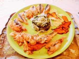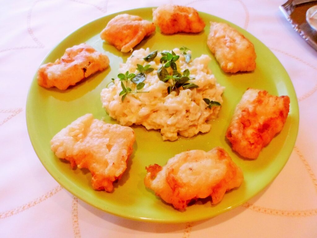 Aprile 27, 2021 RICETTE DI CUCINA articoli 400 admin LE RICETTE DI CASA MIA TRECENTOUNESIMA PARTE 27/04/2021 IN CUCUNA CON AMORE E CON FEDERICA Elena Come prima ricetta di questo articolo oggi presenterò un dolce, una torta all’ananas meravigliosa per colazione, o a fine pasto o merenda. TORTA ALL’ANANAS Ingredienti per la frolla: un uovo e un tuorlo, 125 g di burro, 125 g di zucchero semolato, 200 g di farina per dolci, mezzo cucchiaio di estratto di vaniglia, la scorza grattugiata di un limone. Per il ripieno: un ananas grande, amido di mais o farina per dolci, zucchero q.b., limoncello o rum. per la glassa: 150 g di zucchero di canna, 100 ml di amaretto e 50 g di burro di cacao. Esecuzione: facciamo una buona frolla croccante mescolando le uova con lo zucchero, la farina, la vaniglia e il burro; la stendiamo nella teglia fin sopra i bordi e la mettiamo in frigorifero per mezz’ora. Adesso tagliamo l’ananas a fette, togliamo il torsolo nel centro, la buccia e tagliamo due fettine a dadini, il resto lo spremiamo per fare la crema pasticciera. Nel frattempo spadelliamo l’ananas con 50 g di zucchero di canna, una volta raffreddata la crema uniamo i piccoli pezzetti di ananas e la versiamo sulla frolla, la mettiamo in forno a 200° per 35 minuti; controlliamo la cottura e aspettiamo che raffreddi, poi stenderemo la glassa lucida composta da burro di cacao, amaretto e zucchero di canna. Una delizia! Federica A me che piace l’ananas da matti figurati se questa torta non mi piacerà. Domenica la farò subito. 28/04/2021 Elena Oggi andiamo col pesce: un mantecato di merluzzetto, e un fritto misto di rana pescatrice, trancio di gallinella, trancio di trota salmonata, davvero con tanto gusto. UN ALTRO PIATTO DI FRITTO MISTO DI PESCE Ingredienti: merluzzetto 500 g al netto, due cipolle bianche, sale, pepe, origano fresco, 300 ml di latte, tabasco, olio extra vergine d’oliva un limone; un trancio di gallinella, un trancio di rana pescatrice, e trota salmonata, acqua minerale frizzante, farina tipo “0”, sale, olio d’oliva o di arachidi. Esecuzione: per primo facciamo il mantecato di merluzzo, tagliando il pesce a piccoli pezzetti, poi soffriggere le due cipolle bianche, uno spicchio di aglio, un po’ di sale, tabasco, origano, aggiungere il latte e lasciare sobbollire per 40 minuti. Nel frattempo facciamo la pastella e immergiamo i tranci di pesce nell’olio bollente, poi li adageremo sulla carta assorbente e impiattiamo con al centro il mantecato e ai bordi il fritto. Federica Che bontà! Le tue frittura sono sempre leggere e gustose, e non sono mai fatte con lo stesso pesce. 29/04/2021 Elena Quando ho fatto questo piatto avevo in mente di fare i passatelli asciutti, ma poi mi è venuta quest’idea, con gli stessi ingredienti ho realizzato degli gnocchetti, con l’aggiunta di stracotto di carne tritata, ma appena una manciata circa, ebbene sono usciti fuori degli gnocchi così gustosi che non avevo mai fatto prima d’ora. GNOCCHETTI DI CARNE Ingredienti: duecento g di pangrattato, 150 g di parmigiano, sale, noce moscata, pepe, un uovo intero, 200 g di stracotto di manzo tritato fine, 50 g di farina con quella della lavorazione; scalogno, pomodoro fresco, olio extra vergine d’oliva, piselli, origano fresco, due foglie di alloro, brodo. Esecuzione: lessiamo i piselli, poi sul piano di lavoro mettiamo il pangrattato a fontana con il parmigiano e la carne trita, noce moscata, sale, l’uovo. Facciamo l’impasto che sia omogeneo e che non attacchi alle dita, aiutandoci con un pugno di farina; una volta creati gli gnocchetti, incominciamo a fare il sugo, facendo rosolare lo scalogno, poi abbiamo sbollentato i pomodori freschi ne abbiamo ricavato la polpa, aggiungiamo l’alloro e facciamo cuocere il sugo per venti minuti, adesso incorporiamo i piselli, poi un po’ di pepe e origano fresco. Caliamo gli gnocchetti nel brodo, li scoliamo non troppo asciutti, mantechiamo bene infine una manciata di parmigiano e un giro di olio e il piatto è pronto da gustare. Federica Sai che mia mamma ha fatto tutti i tuoi piatti! Figurati se non facciamo questo! 30/04/2021 Elena Un altro primo, un risotto coi fiocchi, gustoso e cremoso al punto giusto; eccolo! RISO CREMOSO ALLA ZUCCA Ingredienti: riso q.b. brodo vegetale, zucca, sale, pepe, alloro, ginepro, chiodo di garofano, salamino piccante, due cucchiai di salsa di pomodoro fatta in casa, rosmarino, latte, parmigiano, una grossa cipolla, brandy. olio extra vergine d’oliva o burro. Esecuzione: facciamo scottare il riso, in un’altra casseruola facciamo un soffritto di cipolla con un po’ di olio, poi trasferiamo il riso e sfumiamo col brandy. Ora mettiamo la salsa di pomodoro, il salamino tagliato a rondelle, il ginepro, il chiodo di garofano, il rosmarino, aggiustiamo di sale e pepe, a questo punto incorporiamo la zucca già lessata e schiacciata con la forchetta, poi il brodo e copriamo a metà coperchio. Portiamo ad ebollizione e abbassiamo la fiamma e togliamo il coperchio, lasciamo cuocere il riso al dente, mantechiamo col latte, poi a fuoco spento mettiamo il parmigiano, abbondante, lo giriamo bene e impiattiamo. Il risotto risulterà cremoso e gustoso, una meraviglia! Federica Meraviglioso davvero! 02/05/2021 Elena Le mie polpette allungate sono una favola! Eccole nella foto in basso. POLPETTE ALLUNGATE Ingredienti: 200 g di carne macinata di vitello, 200 g di carne macinata di suino, sale, pepe, tabasco, parmigiano, pane raffermo, latte, concia per salami, aglio, origano, pan grattato fine, olio extra vergine d’oliva, un bicchierino di prosecco, salsa di pomodoro, peperoni, funghi porcini, una cipolla bianca, mezzo mestolo di brodo vegetale. Esecuzione: mettiamo il pane raffermo nel latte, mescoliamo le carni, mettiamo la concia, l’origano e l’aglio tritati, ora mettiamo il pane strizzato bene, poi il parmigiano grattugiato, un po’ di pangrattato. Mescoliamo bene, aggiungiamo anche il tabasco e un po’di pepe poi form