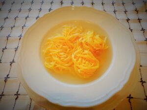 Maggio 15, 2021 RICETTE DI CUCINA articoli 400 admin LE RICETTE DI CASA MIA TRECENTOTREESIMA PARTE 15/05/2021 IN CUCINA CON AMORE E CON FEDERICA Elena Inizio questo articolo con un secondo piatto, molto buono: sono i finocchi ripieni in un letto di finocchi alla crema di parmigiano. FINOCCHI RIPIENI Ingredienti: acquistare il finocchio che ci serve. Olio extra vergine d’oliva, besciamella leggera, parmigiano, latte q.b., erba cipollina, basilico, origano, noce moscata, spezie miste, prezzemolo, panco, un uovo intero, carne macinata scelta mista: vitellone e suino, pane raffermo, aglio, rosmarino, sale e pepe. Esecuzione: Prepariamo i finocchi per il ripieno, servono le foglie esterne e degli stecchini, li sagomiamo un po’ e li mettiamo a cuocere nel latte per qualche minuto, perché le foglie esterne sono sempre le più dure. Intanto prepariamo la carne, la besciamella, le spezie, le erbe: cipollina, prezzemolo, basilico, origano, un uovo, poi il pane strizzato il parmigiano grattugiato, sale e pepe, rosmarino, aglio e panco; facciamo un bell’impasto omogeneo e riempiamo i finocchi fissandoli con gli stecchini. In forniamo a 140° per venti minuti e i nostri finocchi sono pronti e ben dorati. Nel frattempo abbiamo preparato i cuori di finocchi, li abbiamo cotti al dente, con noce moscata, salati e pepati e abbiamo messo la crema di parmigiano. Adesso è arrivato il momento di impiattare: eccoli, belli dorati e contornati di cuori di finocchi che sanno di crema profumata di spezie e parmigiano. Federica Che delizia! 17/05/2021 Elena Oggi invece abbiamo un primo piatto ma lo chiamerei piatto unico: è composto da tagliatelle fatte in casa, con polpettine di tonno rosso, triglie, e farro, una delizia per il palato e per la salute. TAGLIATELLE AL PESCE E FARRO Ingredienti per la pasta: un uovo per ogni 100-10 g di farina per pasta fresca o semola di grano duro. Per le polpettine: una fetta di tonno rosso, sei triglie, panco q.b., parmigiano, farro cotto il giorno prima, sale, spezie, peperoncino, cipolla bianca, porro, salsa di pomodoro fatta in casa, brodo, vino bianco per sfumare, piselli, alloro, olio extra vergine d’oliva, rosmarino. Esecuzione: per prima cosa facciamo il pesce al forno, poi lo puliamo dalle lische, lo passiamo al macina tutto, e lo adagiamo in una zuppiera capiente. Aggiungiamo il farro, sale, pepe, spezie miste, peperoncino, cipolla un po’ di porro macinato finemente, formaggio grattugiato, e un po’ di panco. Adesso facciamo il ragù con la salsa di pomodoro, la cipolla, l’alloro, il rosmarino, sfumiamo col vino, saliamo e pepiamo e incorporiamo i piselli lessati al dente; li portiamo a cottura insieme al ragù. Friggiamo le polpettine, poi le passeremo nella casseruola del sugo, e incominciamo a fare la sfoglia per le tagliatelle. Lasciamo riposare la pasta per mezz’ora poi la caliamo nell’acqua che bolle salata e le trasportiamo nel sugo, andranno condite con l ‘aggiunta di olio e parmigiano. Federica Meravigliose e leggere. 18/05/2021 Elena Presento un altro piatto di pasta, molto gustosa e leggera. RIGATONI AL BRODO DI CARNE E ZAFFERANO Ingredienti: brodo di carne, due bustine di zafferano a persona, olio extra vergine d’oliva, parmigiano, noce moscata, crema di parmigiano pepe, cipolla, brandi (per sfumare) basilico. Esecuzione: facciamo un soffritto con una cipolla due cucchiai di olio, sfumiamo con mezzo bicchierino di brandy, aggiungiamo un mestolino di brodo e lo zafferano. Caliamo la pasta nel brodo bollente, la scoliamo al dente e la versiamo nella casseruola del soffritto, mantechiamo, aggiungiamo la crema di parmigiano, una manciata di parmigiano, un po’ di olio e qualche fogliolina di basilico. Una vera bontà. Federica Semplicità e bontà! 19/05/2021 Elena Da molto tempo ormai non facevo la zuppa di cipolle, ebbene, l’ho rifatta ed è diventata più buona. LA ZUPPA DI CIPOLLE DI CASA MIA Ingredienti per 4 persone: quattro cipolle medie, un porro, una crosta di parmigiano, peperoncino, sale, pepe, parmigiano, un uovo, tre cucchiai di amido di mais, una patata, mezzo bicchiere di vino bianco, due foglie di alloro, olio extra vergine d’oliva, rosmarino, un pizzico di noce moscata, bruschette. Esecuzione: tagliamo a fettine le cipolle e un mezzo porro, le poniamo in una casseruola con 4 cucchiai di olio; le facciamo soffriggere, poi sfumiamo col vino, aggiungiamo la patata tagliata a pezzi, l’alloro, la noce moscata, il peperoncino, qualche ago di rosmarino, la crosta del formaggio e due litri di acqua. Facciamo bollire il tutto fino alla cottura; maciniamo tutto con il passaverdura, facciamo una tritura con l’uovo, il parmigiano grattugiato, (quattro cucchiai), tre cucchiai di amido, e diluiamo con un po’ di brodo freddo per non cuocere l’uovo, incorporiamo delicatamente la crema e sempre mescolando otterremo una zuppa cremosa, aggiungiamo ancora qualche cucchiaio di formaggio, un altro soffrittino fatto con il porro rimasto, qualche goccia di olio, un giro di pepe e la zuppa è pronta, molto ma molto gustosa. Federica Mi ricordo quando la mangiai a casa tua, era veramente squisita! 20/05/2021 Elena Ecco la ricetta di oggi: vitello arrosto in crema di tartufo. Se qualcuno vi regala un pezzetto di tartufo ricordatevi di questa ricetta. VITELLO IN CREMA DI TARTUFO Ingredienti: acquistiamo la quantità di carne che ci serve, sale, pepe, rosmarino, mentuccia, vino bianco per sfumare, aglio, brodo, amido di mais, briciole di tartufo, olio extra vergine d’oliva gentile, spezie miste per massaggiare la carne in marinatura. Esecuzione: Incominciamo col massaggiare la carne con la concia. La lasciamo riposare per qualche ora, poi la sigilliamo, aggiungiamo le erbe, sfumiamo col vino, poi mettiamo il brodo e copriamo la casseruola a metà. A cottura ultimata la lasciamo raffreddare e la mettiamo in frigorifero per tutta la notte, l’indomani tagliamo la carne a fettine, poi mettiamo il suo sugo nel mixer con le briciole di tart