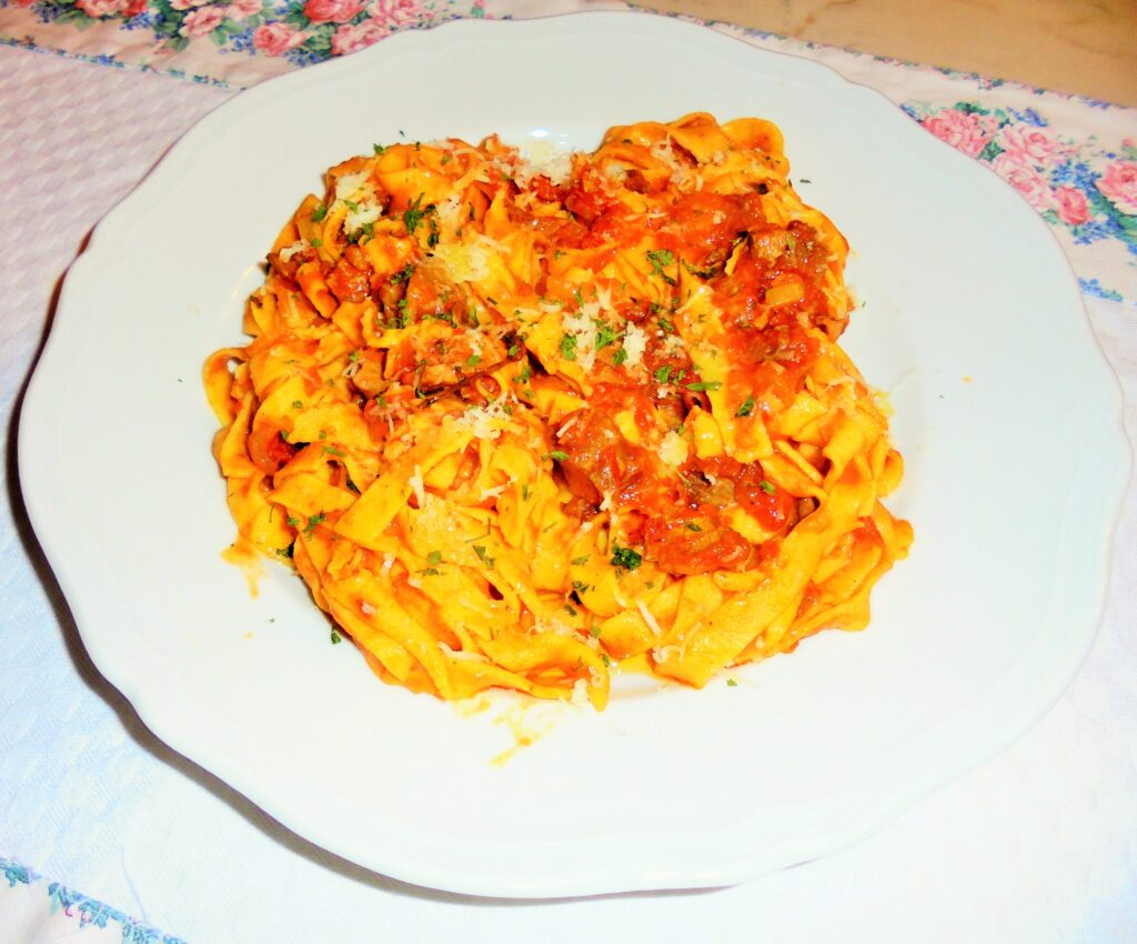 Esecuzione: soffriggere in poco olio lo scalogno e il porro tritati, aggiungere le carni macinate finemente, sfumare col vino, aggiungere la salsa d pomodoro, le spezie, le erbe e lasciare cuocere con il coperchio per mezz’ora. Nel frattempo facciamo la sfoglia e le tagliatelle; le lasciamo asciugare e intanto mettiamo a bollire il brodo vegetale, poi caliamo le tagliatelle, le mantechiamo e a fuoco spento aggiungeremo il parmigiano grattugiato.