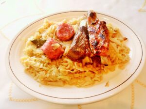 Ingredienti: fettine di vitello, rosmarino, salvia, aglio, sale, pepe, noce moscata, cumino, brandy, burro, un po’ di brodo. Per il contorno: finocchi, latte, spezie miste, uova, sale, aceto di mele, olio extra vergine d’oliva, parmigiano grattugiato.