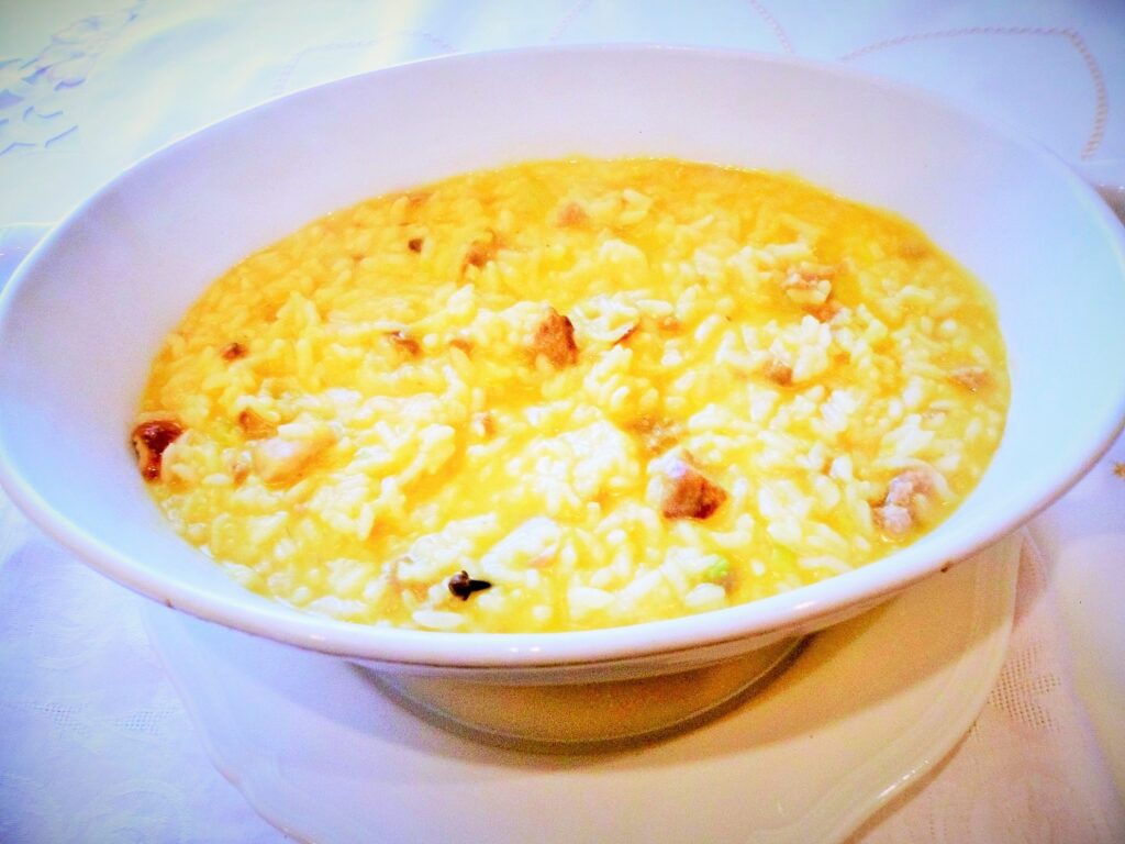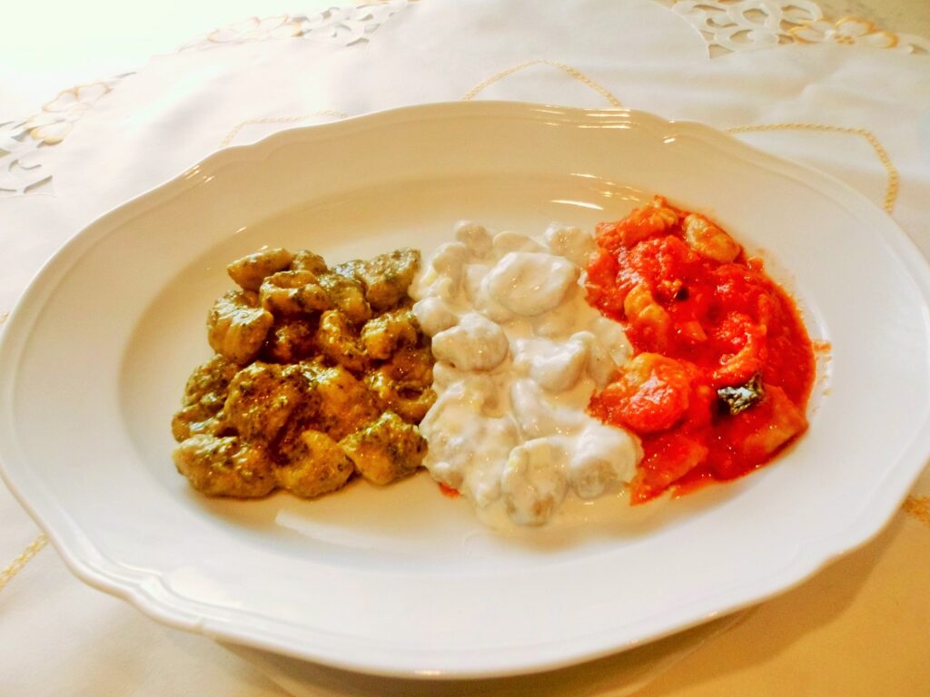 Ingredienti: due fette grandi di zucca, 700 g, 200 g di farina tipo “0”, sale, pepe, noce moscata, 50 g di parmigiano grattugiato + quello per il condimento, un uovo, buccia di limone o di arancia grattugiata, olio extra vergine d’oliva, salsa di pomodoro fatta in casa, tre cipollotti, due salsicce, rosmarino, brodo vegetale.
