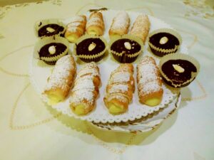Agosto 28, 2020 RICETTE DI CUCINA articoli 400 admin LE RICETTE DI CASA MIA DUECENTOSETTANTOTTESIMA PARTE 28/08/2020 IN CUCINA CON AMORE E CON FEDERICA Elena Cuciniamo ancora un po’ di pesce, la cernia di lago in salsa. CERNIA IN SALSA Ingredienti: cernia q.b. , succo di agrumi misti, un peperone giallo, ananas, sale, peperoncino, olio extra vergine d’oliva, pancetta grigliata, carote in agrodolce, erbe aromatiche, porri, cicoria, aceto di mele. Esecuzione: Puliamo bene il pesce e lo tagliamo a tranci. Dopo avere marinato il pesce con il succo di agrumi, peperoncino, sale e olio, lo mettiamo sulla piastra dalla parte della pelle, quando sarà croccante lo giriamo per qualche secondo. abbiamo fatto la crema al peperone, la crema di ananas, e abbiamo pulito e passato in padella i porri poi la cicoria; ora possiamo servire nei piatti da portata. Eccolo nella foto sopra! Federica Sinceramente anche se il pesce non mi piace tanto, nei tuoi piatti lo mangerei tutti i giorni. Elena Grazie! Esageratina. 31/08/2020 Elena Il dolce che detto oggi è quella torta da forno con i lamponi; quella che ti piace molto. TORTA DA FORNO AI LAMPONI Ingredienti: tre uova, 150 g di burro fresco, 200 g di zucchero semolato, 200 g di lievito madre, 450 g di farina doppio zero, 400 g di lamponi freschi, la scorza grattugiata di un limone, un cucchiaino di estratto di vaniglia, zucchero a velo vanigliato. Esecuzione: mescolare le uova con lo zucchero, incorporare il lievito madre, e i restanti ingredienti tranne i lamponi. lasciare riposare l’impasto a temperatura ambiente per un giorno, poi aggiungere i lamponi lavati e asciugati (tamponati delicatamente) amalgamare dal basso verso l’alto e infornare a 180° centigradi per 40 minuti a calore statico. Ecco il risultato nella foto sopra. Federica Non sono esagerata se ti dico che questo dolce nella sua semplicità è paradisiaco! 02/09/2020 Elena Che ne dici se oggi ti presento i miei canederli rivisitati? Li ricordi? Sono quelli che feci lì da te l’ultimo dell’anno del 2016. Sono piaciuti a tutti, dai che diamo la ricetta. CANEDERLI RIVISITATI DI CASA MIA Ingredienti per 6 persone: due salamelle, 300 g di erbette, sale, pepe, salsa di pomodoro fatta in casa, due cipolle grosse più una tropea per il sugo, origano, basilico, prezzemolo, 200 g di parmigiano, 200 g di formaggio di montagna o caciocavallo, oppure asiago non troppo stagionato, latte, 4 Hg di pane senza la crosta, brodo di carne, spezie miste, un peperone, olio extra vergine d’oliva, pangrattato. Esecuzione: lessiamo le erbette, le passiamo al mortaio e le strizziamo bene. Mettiamo il pane ad ammollare nel latte, quando si sarà ammorbidito bene strizziamo bene anch’esso e lo uniamo alla verdura compreso il peperone sbollentato, spellato e passato al mortaio, le salamelle grigliate e tritate, uniamo anche le cipolle cucinate alla cacciatora, sale, le erbe, e un po’ di spezie miste; adesso uniamo i formaggi e facciamo l’impasto ( se è troppo bagnato uniremo del pangrattato). Formiamo i canederli, li mettiamo in casseruola nel sugo, sfumiamo il tutto col vino bianco, aggiungeremo un mestolo di brodo, copriamo e facciamo cuocere per 10 minuti. Prima di servire mettiamo una manciatina di prezzemolo, il pepe e un giro di olio. Buon appetito! Federica Anche questi, come faccio a dirti che non sono meravigliosi? Sono stati apprezzati da tutti! 04/09/2020 Elena Adesso voglio mostrarti i cappellettini del cacciatore all’anatra selvatica. CAPPELLETTI DEL CACCIATORE Ingredienti per il ripieno: un’anatra selvatica, due grosse cipolle, spezie miste, ( chiodi di garofano, pepe, noce moscata) una costa di sedano, due carote, tre foglie di salvia, due spicchi di aglio, carne macinata da salame, due pomodori, un cucchiaio di paprica non piccante, vino rosato, parmigiano grattugiato tre etti, pangrattato q.b. Esecuzione: dopo aver pulito l’anatra, la mettiamo nella casseruola con le verdure tagliate a pezzi grandi, le spezie, uniamo il vino e lasciamo evaporare, poi aggiungeremo brodo vegetale e iniziamo a fare lo stracotto facendo sobbollire il tutto a fuoco lento; nel frattempo grigliamo la carne da salame e la uniamo all’intingolo . Una volta fatto lo stracotto, disosseremo la carne, la tritiamo uniformemente fine, la mettiamo in un recipiente abbastanza capiente e aggiungiamo il parmigiano, il pangrattato, aggiustiamo di sale e versiamo il brodo rimasto. Il ripieno deve risultare ben saldo che non attacchi alle dita e si procede per i cappelletti usando un uovo per ogni 100 g di farina per pasta fresca o semola. Elena Questo piatto l’ho realizzato a casa di Federica quasi due anni fa. 08/09/2020 Elena Voglio mostrarti dei dolcetti, sì, questa volta mi sono venuti bene, la crema non fuoriesce. CANNONCINI E CREMINI Ingredienti per i cremini: cioccolato fondente 250 g, 200 g di crema di cappuccino, addensata con amido di mais, 200 g di zucchero a velo con vaniglia, 150 g di pasta di mandorle, 300 g di mandorle frullate, estratto di vaniglia, latte q.b. per sciogliere il cioccolato fondente. Esecuzione: sciogliamo il cioccolato fondente con il latte (deve risultare una crema non troppo liquida e nemmeno troppo solida. Aggiungiamo lo zucchero, le mandorle frullate finemente, l’estratto di vaniglia; amalgamiamo bene il tutto, e lo verseremo negli stampini riempendoli meno della metà. Abbiamo già preparato la crema cappuccino e la versiamo sopra, poi copriamo il tutto con il resto dell’impasto al cioccolato. Decoriamo con mandorle tostate poi mettiamo i dolcetti in frigorifero per una notte e la mattina seguente sono pronti da consumare. Ingredienti per i cannoncini o cannoli: pasta sfoglia fresca, stampi per cannoncini, zucchero a velo, miele, crema pasticciera fatta con l’amido di mais, due uova intere, zucchero semolato, estratto di vaniglia e latte intero. Esecuzione: prepariamo la pasta sfoglia il giorno prima oppure l’acquistiamo surgelata, tagliamo delle liste larghe cm 2,50 