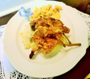 Marzo 27, 2018 RICETTE DI CUCINA articoli 400, VARIE E RISPOSTE AI LETTORI admin LE RICETTE DI CASA MIA DUECENTOQUARANTANOVESIMA PARTE 27/03/2018 IN CUCINA CON AMORE E CON FEDERICA Federica A Pasqua vorrei fare un dolce classico e semplice ma allo stesso tempo tradizionale, cosa potrei fare che non sia la solita colomba o torte? Elena Ci sono dolci che possono essere rivisitati con creatività, per esempio le bignole con l’impasto al sapore che preferisci, e farcite di creme miste; poi un’altra variante può essere la torta tagliatella alle mandorle e crema di mandorle e cioccolato; si potrebbe fare anche una buona crema chantilly accompagnata dal salame dolce rivisitato. Federica Mi va bene l’ultima, grazie. CREMA CHANTILLY E SALAME DOLCE RIVISITATO Ingredienti per il salame: cinquanta g di cacao amaro, cento g di zucchero a velo, cento g di nocciole tostate, cento g di mandorle tostate, centocinquanta g di biscotti secchi, due uova, cento g di cioccolato fondente sciolto a bagno maria, settanta g di burro, mezzo bicchierino di liquore a preferenza, due bacche di vaniglia. Per la cream chantilly: cento g di panna montata parzialmente, centocinquanta g di crema inglese o crema pasticciera, fragole, decorare con panna montata. Esecuzione: facciamo la crema pasticciera, poi montiamo la panna solo parzialmente e la incorporiamo sulla crema raffreddata, guarniremo con la panna montata perfettamente, (altrimenti si smonta) e poi abbineremo alcune fettine di salame dolce e fragole. Facciamo il salame sbattendo le uova con lo zucchero, aggiungeremo il burro, il cacao, il cioccolato fondente sciolto a bagnomaria, poi i biscotti tritati e la frutta secca tostata e gli aromi. Mescoliamo per amalgamare bene gli ingredienti e poi formeremo il salame avvolto nella carta da forno, lo lasceremo riposare un giorno prima del consumo. Ed eccoli nella foto in alto. Federica Mi piace molto, grazie. Elena Nella decorazione non ho aggiunto altro perché il salame ha già dentro molti ingredienti saporiti. 29/03/2018 Elena Se vuoi un piatto magro ma molto saporito e leggero ti leggo la ricetta e puoi vedere la foto sotto. Sono i cappelletti senza ripieno, conditi con sugo alle erbe, pomodoro e fagioli. CAPPELLETTI SENZA RIPIENO Ingredienti: quattrocento g di semola o farina per pasta fresca, tre uova, sugo di pomodoro fatto in casa, fagioli borlotti stufati con erbe e conditi con parmigiano eolio extra vergine d’oliva; pecorino e parmigiano grattugiati, basilico, origano, rosmarino. Esecuzione: facciamo a sfoglia fresca, poi tracciamo dei quadratini, e uniremo due basi girandole su se stesse, come si fa con i cappelletti veri. Li lasciamo riposare e nel frattempo preapreremo il sugo con il sugo di pomodoro fatto in casa e pronto per l’uso, uniremo lo stufato di fagioli fatto con gli scalogni, vino, brodo vegetale e spezie, poi lo condiremo con un po’ di parmigiano e olio. Ora scoliamo la pasta al dente, cotta nel brodo e la metteremo nella casseruola del sugo, mantechiamo, e a fuoco spento metteremo il parmigiano e un giro di olio e pepe. Sono di un gusto e di una leggerezza incredibile. Federica Le tue ricette sono magiche! Elena Anche le tue! 29/03/2018 Elena A Pasqua in molte famiglie abbiamo ancora una volta protagonista il baccalà. Io lo presento in due versioni: l’ho cucinato in bianco con i cipollotti, e l’ altro l’ho fatto in crocchette. Sono buoni entrambi. Federica Il baccalà è sempre un grande piatto! BACCALÁ IN DUE VERSIONI Ingredienti: baccalà dissalato q.b., pangrattato fine, aglio e prezzemolo, alloro, capperi, aceto di acero, cipollotti bianchi, latte, parmigiano grattugiato, chiodo di garofano, patate, olio extra vergine d’oliva, miele, cerfoglio, sale e pepe.q.b., cicoria verde e cicoria bianca farina di tipo”0″ + un 20% di farina di mais macinato fine, vino bianco secco, olio per frittura. Esecuzione: mettiamo subito le verdure a lessare al vapore, tranne i cipollotti che verranno cucinati in agrodolce. Adesso tagliamo a pezzetti il baccalà, togliendo tutte le lische, poi, metà lo cucineremo in umido al tegame passato nel pangrattato, e parmigiano, erbe sale e pepe. L’altra metà la faremo fritta in crocchette soffici dentro e croccanti fuori. Passiamo all’altra parte che prima passeremo nella pastella e faremo una frittura leggera al punto giusto. Federica A Pasqua metterò in tavola anche questo piatto. 30/03/2018 Elena Sto mostrando un’altra ricetta di un secondo piatto molto buono ma che a me sinceramente non piace, si tratta del’agnello, le costolette di agnello. COSTOLETTE DI AGNELLO Ingredienti: costolette di agnello q.b., vino rosato, sale, pepe, un pizzico di rafano, rosmarino, timo, salvia, due chiodi di garofano, un pizzico di cannella, olio extra vergine d’oliva, una noce di burro, aglio, scalogno. Esecuzione: mettiamo a bagno le costolette nel vino con sale, pepe, garofano, cannella e rafano. Il mattino seguente le metteremo a dorare in padella senza grassi aggiunti, dopo la doratura aggiungeremo le erbe, un po’ di burro e un mestolo di brodo. A cottura ultimata servire in un letto di topinambur trifolati e patatine al forno. Federica A me le costolette di agnello piacciono solo così, diversamente cucinate hanno ancora quel sapore che non mi piace per niente. Elena Ed ora presentiamo la terza torta pasquale, fatta di tre creme e cioccolato. TERZA TORTA PASQUALE Ingredienti: gianduia, cioccolato fondente, zucchero a velo, glassa di fragole, due dischi di pan di Spagna sottile, panna montata, crema alla banana, crema alla fragola, crema al cioccolato fondente. Esecuzione: incominceremo dal pan di Spagna, nel frattempo faremo le creme con le fragole frullate e setacciate, le addensiamo e le mescoliamo alla crema di panna, la stessa cosa faremo con le banane e con il coccolato. Andranno tutte nell’abbattitore e poi comporremo la torta con il pan di spagna spennellato nel limoncello fatto in casa. Per decorare abbiamo fatto delle scaglie 