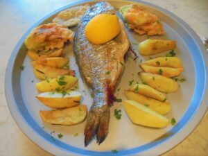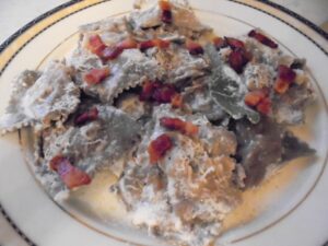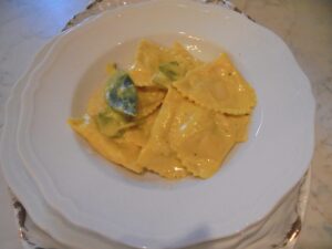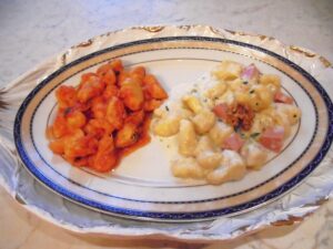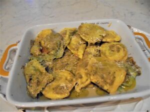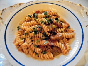 Giugno 26, 2023 RICETTE DI CUCINA articoli 400 admin LE RICETTE DICASA MIA TRECENTOSETTANTASEIESIMA PARTE 26/06/2023 IN CUCINA CON AMORE E CON FEDERICA Ingredienti: un’orata grande, sale, pepe, tabasco, rosmarino, salvia, aglio, prezzemolo, limone. Per la marinatura: succo di arancia, succo di lime, sale, prezzemolo, erba cipollina, olio extra vergine d’oliva. Esecuzione: pulire bene l’orata e lavarla accuratamente. Metterla a marinare nel succo di un’arancia spremuta e un lime, sale, erba cipollina e prezzemolo. Dopo un paio d’ore togliamo il tutto e la riempiremo con le altre erbe citate sopra, sale, pepe, una punta di tabasco, olio extra vergine d’oliva e con il quale la spennelliamo; la mettiamo in forno a 200° per 10 minuti, nel frattempo friggiamo le patatine a secco con qualche fiore di zucca e li serviremo insieme all’orata. Federica Buonissima fatta così, saporita e leggera. Tu sei sempre stata brava a cucinare il pesce, peccato che però a te il pesce non piaccia. Elena Grazie cara fede, non è che il pesce a me non piaccia, mi piaceva tantissimo! Ma da tempo ormai lo cucino soltanto perché anche essendo buonissimo non riesco a mandarlo giù, per tutti i caduti in mare; è una questione di punti di vista. 27/06/2023 Elena Un piatto gustoso con farciture estive; sono i tortelloni ripieni di fiori di zucca e ricotta, altri con borragine e ricotta, gogonzola dolce. Molto buoni. TORTELLONI IN DUE VERSIONI Ingredienti: farina per pasta fresca oppure semola di grano duro, uova, borragine, gorgonzola, fiori di zucca, ricotta, olio extra vergine d’oliva, sale, pepe, latte, parmigiano reggiano, salvia, cipollotti, noce moscata, tabasco. Esecuzione: incominciamo col eseguire i ripieni, setacciamo la ricotta, in una padella facciamo rosolare i cipollotti tagliati finemente, i fiori di zucca a listarelle, poi li uniamo a metà della ricotta, saliamo, pepiamo e aggiungiamo anche il gorgonzola e la noce moscata. Amalgamiamo bene il tutto e passiamo all’altro ripieno: abbiamo sbollentato la borragine, abbiamo aggiunto la noce moscata, un po’ di tabasco, il gorgonzola dolce, e abbiamo amalgamato bene il tutto. Adesso che abbiamo pronti i due ripeni, impastiamo per tirare la sfoglia, che poi andremo a riempire e daremo ai ravioli alcune forme. L’acqua bolle, il sale c’è, caliamo i ravioli un po’ per volta poi li scoliamo in una teglia dove abbiamo messo un pesto di salvia, e crema di parmigiano. Eccoli nella foto sopra; squisiti davvero! Fedeirca Immagino già i sapori e le consistenze. 28/06/2023 Elena Oggi presento una ricetta gustosa, fresca, nutriente fatta con le verdure ed erbe di stagione: è il pasticcio di zucchine in besciamella leggera. Squisito. PASTICCIO DI ZUCCHINE IN BESCIAMELLA LEGGERA Ingredienti: 4 zucchine di media grossezza, sale, pepe, tabasco, prosciutto cotto a fettine, parmigiano reggiano, olio extra vergine d’oliva, salvia, noce moscata, spezie miste, menta, prezzemolo, aglio, farina tipo “0”, latte, olio per friggere. Esecuzione: per prima cosa tagliamo le zucchine per il lungo, dallo spessore di qualche millimetro; le saliamo e le lasciamo riposare un’oretta. Nel frattempo facciamo un besciamella leggera con latte, farina, olio extra v. d’oliva, spezie, noce moscata, parmigiano grattugiato. Adesso prendiamo le zucchine, le mettiamo in un piatto largo dove abbiamo fatto una marinatura con olio, menta, salvia, aglio, tabasco, sale e pepe; le lasciamo marinare per trenta minuti poi le mettiamo sulla griglia per qualche secondo (non devono spapolarsi perché poi dovranno continuare la cottura in forno. Mettiamo insieme il nostro pasticcio prendendo una teglia, sul fondo mettiamo qualche cucchiaio di besciamella, poi copriamo con le zucchine grigliate, una spolverata di parmigiano, il prosciutto, le zucchine e la besciamella, via via fino a quando la teglia non si sarà riempita. Copriamo con un po’ di parmigiano grattugiato e erbe poi inforniamo a 160° per 30 minuti e il piatto sarà pronto. Federica Sai che è come se le avessi assaggiate? Sono squisite! 29/06/2023 Elena A noi piace molto la pasta sfoglia, prima di riuscire a farla come piace a me confesso che ho provato molte volte. Ora però ne è valsa la pena perché mi riesce fragrante, leggera senza il lievito; l’importante è fare molti passaggi: prima per un verso e poi per l’altro, nel senso di amalgamarle ben dal lato verticale e poi passare a quello orizzontale e così via. La mia è buonissima se fatta e usata, se la metto nel congelatore poi cambia notevolmente. Ma niente paura perché non si perde molto tempo a realizzarla: basta impastare bene la prima volta, poi ogni mezz’ora circa la si riprende dal frigorifero e si ripiega, nel frattempo possiamo fare qualcos’altro. SACCOCCI DI PASTA SFOGLIA FRESCA FARCITI Ingredienti per la pasta sfoglia: farina “00”, acqua, sale, burro e molti passaggi. Per la farcitura: salumi, formaggi e verdure. Esecuzione: impastiamo con acqua , sale e farina, formiamo un panetto non troppo consistente, ma che non attacchi alle dita (deve essere vellutato, si tira col mattarello, poi si appoggia sopra il burro a temperatura ambiente, si chiude il panetto a portafogli e lo si passa ancora col mattarello; si ripone mezz’ora in frigorifero e si ripassa dall’altro senso cioè se abbiamo tirato la sfoglia verticalmente, ora la giriamo e la tiriamo orizzontalmente, e così via per tutta la giornata. Il risultato è questo che vedete nella foto; il resto poi è facile, si prende la sfoglia, si traccia e si taglia un rettangolo o un cerchio o altre forme, e si farciscono con quello che vogliamo poi si cuoce in forno a temperatura alta per 15 minuti. Federica Diciamo che la tua sfoglia la mangerei tutti i giorni, come quella della pasta fatta in casa. Elena Grazie! 30/06/2023 Elena La pasta è sempre la pasta, ma si può condire in una miriade di maniere; questa che presento oggi sono i fusilli con stracotto di anatra, erdure ed er