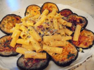Ottobre 4, 2023 RICETTE DI CUCINA articoli 400 admin LE RICETTE DI CASA MIA TRECENTOSETTANTOTTESIMA PARTE 04/10/2023 IN CUCINA CON AMORE LEALTÁ E CON FEDERICA Elena Come ogni anno mi piace festeggiare la vendemmia, per l’occasione cerco sempre di cucinare dolcetti con l’uva o con il budino di mosto tipici nelle nostre zone: Emilia Romagna e Lombardia. Per quest’autunno ho fatto dei muffins e un tortino da regalare (noi li chiamiamo buffette) MUFFINS E TORTINO CON L’UVA Ingredienti per i muffins e per la torta: 500 g di uva piccola tipo uva fragola o ancellotta, 500 g di farina tipo “00”, 250 g di zucchero semolato, estratto di vaniglia, 150 ml di olio di mais, quattro uova, un limone, mezzo bicchiere di latte, zucchero a velo con vaniglia, un bustina di lievito per dolci. Esecuzione: laviamo e asciughiamo bene l’uva e la sgraniamo. In un recipiente grande mettiamo la farina setacciata, lo zucchero, le uova, l’olio, la vaniglia, la scorza del limone grattugiata e amalgamiamo bene il tutto senza però lavorare a lungo l’impasto. Adesso aggiungiamo un po’ di latte, mescoliamo bene, e incorporiamo anche il succo di mezzo limone, dopo di questa operazione è il momento del levito, infine aggiungiamo i chicchi di uva asciugati bene; mescoliamo delicatamente per distribuire l’uva e versiamo il contenuto negli stampi imburrati per muffin, e il resto lo verseremo in una teglietta anch’essa imburrata e infarinata. Mettiamo in forno i muffin per 20 minuti a 175° e quando li leveremo dal forno metteremo a cuocere la torta sempre a 175 ° per 40 minuti. Eccoli entrambi deliziosi Federica Sai che mi hai fatto ingolosire? La voglio! Elena Certo! Quando verrai a trovarmi la prepareremo insieme. 09/10/2023 Elena Chiamarli ravioli, allora direte: ma quante forme di ravioli ci sono? Io li chiamo semplicemente quadrotti di pasta al mosto ripieni; sono davvero squisiti! QUADROTTI DI PASTA AL MOSTO RIPIENI Ingredienti: farina per pasta fresca, un uovo ogni 100-110 g di farina, sale, mosto di uva nera (la quantità desiderata dovrà sostituire un uovo grande). Per il ripieno: ricotta, tre pesche settembrine, 6 amaretti, sale, pepe, cannella, scorza di limone grattugiata, un p’ di panco per rendere il ripieno abbastanza compatto; per il condimento: parmigiano reggiano, pancetta steccata, crema di latte, pepe. Esecuzione: dopo avere lavato e snocciolato le pesche, le abbiamo cotte al forno con la buccia, poi le abbiamo lasciate intiepidire e svuotate con un cucchiaino; abbiamo aggiunto la cannella, gli amaretti, la scorza del limone grattugiata, sale, pepe, panco q.b. e la ricotta setacciata. Abbiamo fatto un composto omogeneo e dopo aver tirato la sfoglia abbiamo riempito i nostri quadrotti. Abbiamo messo l’acqua a bollire e nel frattempo abbiamo rosolato i dadini di pancetta e fatto la crema di latte. Una volta calati i quadrotti molto delicatamente li abbiamo messi nella casseruola della crema di latte, poi abbiamo pepato ancora un po’, aggiunto il parmigiano grattugiato, e la pancetta grigliata. Eccola la nostra bontà. Federica Sai che Alessandra ne ha mangiate due porzioni? Erano squisiti! Elena Grazie! 11/10/2023 Elena Ogni tanto ci sta bene anche una ricetta di carne, come quella di oggi che sono fettine di scamone in un sugo di sapori di stagione; è una ricetta gustosissima. SCAMONE AI SAPORI DELL’AUTUNNO Ingredienti: fettine di scamone, pomodoro fresco, scalogni 2, origano fresco, sale, pepe, vino bianco amabile, crema di olive verdi, olio extra vergine d’oliva, crema di asiago, peperoncino piccante, panco. Esecuzione: prepariamo le fettine, le saliamo e le pepiamo, poi facciamo un soffritto con gli scalogni e poco olio, mettiamo i pomodori che abbiamo sbollentato, pelato e tritato bene, sfumiamo col vino. In una padella a griglia grigliamo le fettine, le passiamo nel vino e nel panco, poi le adagiamo nella casseruola del sugo, le facciamo cuocere per 5 minuti e le togliamo dal calore. Adesso facciamo l’ultima operazione: aggiungiamo la crema di olive, l’origano fresco, aggiustiamo di sale e pepe, il peperoncino e un mestolino di brodo, accendiamo il calore e facciamo cuocere per un minuto; infine aggiungiamo la crema di asiago. Ed ecco le nostre gustose bistecche rivestite di sapore, tenere che si sciolgono in bocca. Federica Buonissimissime! 13/10/2023 Elena Che frittelle ripeteva Federica, buone così non le ho mangiate mai! Ma cosa ci hai messo dentro che sono divine? Io le ho risposto che le ho realizzate con pochi ingredienti, i più semplici della terra: cipollotti, rape bianche e patate, funghi, infatti le cose semplici dicono che siano le più buone. FRITTELLE COI PRODOTTI DELLA TERRA Ingredienti: cipollotti bianchi, rape bianche, patate, funghi portobello , aglio prezzemolo, e porcini secchi, spezie miste, un mestolo di brodo, farina doppio zero, sale, pepe, vino bianco secco, olio per friggere, rosmarino, oppure si possono friggere nella friggitrice ad aria; saranno più salutari ma meno gustose. Esecuzione: per prima cosa puliamo e spezzettiamo i portobello e mettiamo in ammollo i porcini secchi. Poi li metteremo a soffriggere in poco olio e uno spicchio di aglio, sfumiamo col vino bianco, saliamo e pepiamo. Adesso tagliamo le verdure, anzi le grattugiamo: prima i cipollotti, poi la rapa infine la patata, uniamo la crema di funghi già raffreddata, le spezie, sale. pepe, un mestolino di brodo e la farina. Otteniamo un impasto omogeneo ma non troppo denso (se vogliamo le frittelle croccanti l’impasto non dovrà essere troppo denso; se le vogliamo morbide allora l’impasto dovrà risultare più denso). Friggiamo e le serviamo ancora calde con prosciutto o formaggi. Federica Non ti dico la bontà! 14/10/2023 Elena Quella che presento oggi non è la carbonara, ma è una pasta altrettanto squisitissima! MACCHERONI ALLA MODA MIA Ingredienti: una melanzana grande, maccheroni, pancetta steccata, un uovo intero e un tuorlo, parmigiano reggiano, sale, pepe,