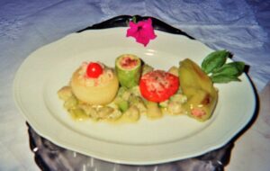 Settembre 23, 2015 RICETTE DI CUCINA articoli 400 admin LE RICETTE DI CASA MIA CENTOSETTANTESIMA PARTE 23/09/2015 IN CUCINA CON AMORE E CON FEDERICA ELENA Prima di passare alle ricette continuiamo con l’argomento ” cellulite”. La cellulite si manifesta principalmente in due forme: quella molle e flaccida e quella dura. Come si distinguono tra di loro? La cellulite solida si distingue al tatto: quando si preme o si pizzica la parte si sente una notevole sensibilità al tatto; questo perché è probabile che venga schiacciata qualche estremità nervosa. Questo tipo di cellulite colpisce in genere donne giovani in ottime condizioni fisiche. La pelle colpita da cellulite dura di solito è secca, al tatto la si sente ruvida, dovuto allo scarso nutrimento che riceve; questo tipo di cellulite costituisce un altro tipo di problema che è quello delle smagliature. Questo avviene non soltanto dopo una gravidanza ma in seguito alla cellulite soltanto: la pelle non potendo adeguarsi all’eccessivo aumento di volume dei tessuti sottostanti, le fibre elastiche e flessibili permettono alla pelle di muoversi, di stendersi, e di contrarsi, ma quando queste fibre vengono tese troppo a lungo si rompono, lasciando i segni dette smagliature. Nella cellulite molle invece…continua domani. Oggi ti presento un piatto che non ha controindicazioni per questo tipo di patologia l’importante è non abusarne. BOCCONCINI DI POLLO ALLE VERDURE CON CROCCHETTE AL FORNO Ingredienti: cosce, sott’ala, e sottocoscia. Asportiamo tutta la pelle e il grasso, e anche le ossa, peperoni verdi gialli e rossi, cipolla, sedano, alloro, rosmarino, dragoncello, origano, cerfoglio, erba luisa, olio extra vergine d’oliva, riso vialone nano, brodo di pollo, parmigiano grattugiato, peperoncino, vino bianco per sfumare, aglio e salvia, pangrattato, latte q.b. Esecuzione: Dopo avere lavato il pollo lo immergeremo nella vinaigrette, dopo trenta minuti lo toglieremo, lo passeremo in casseruola a dorare, poi sfumiamo col vino e aggiungeremo aglio e salvia e qualche ago di rosmarino e dragoncello; a fine cottura lo doriamo di nuovo, lo impiatteremo sopra un letto di verdure fatte al forno a legna. Nel frattempo faremo le crocchette, con il risotto fatto in precedenza e raffreddato, con l’aggiunta di erbe tritate e il parmigiano; formiamo delle crocchette, le arrotoliamo nel latte e nel pangrattato, poi, in forno per 15 minuti circa. Eccole nella foto in alto. La restante vinaigrette va a condire le verdure sottostanti; un’esplosione di sapori! FEDERICA Incomincio a sentire il profumo! Non vedo l’ora che venga domani: chissà cosa mi preparerai? ELENA A domani! 24/09/2015 ELENA Ieri abbiamo parlato di cellulite solida, oggi parleremo di cellulite molle. La cellulite molle non si presenta compatta, intatta come quella solida: tende ad invadere ampie zone e sembra fluttuare liberamente tra i muscoli e la pelle. La differenza è anche che questo tipo di cellulite è evidentissimo, per riconoscerlo non c’è bisogno di toccare i tessuti, perché ha una grande mobilità, la si può facilmente sollevare dal muscolo, proprio perché è staccata, si nota la sua flaccidità come fosse gelatina o ricotta. Le persone a rischio di questo tipo di cellulite sono quelle che hanno condotto una vita attiva e poi ad un tratto si fermano per un certo periodo; altre invece per avere i tessuti poco saldi, con la pelle molle e le vene dilatate, con un tono muscolare scarso per non dire assente. A favorire la cellulite molle sono anche le diete dimagranti drastiche, (come il fai da te che vedi sui giornali) una rapida e drastica riduzione del cibo è dannosissima all’organismo, lo stesso vale con le pillole diuretiche: si perde solo acqua, queste due cose insieme comprese le diete drastiche finiscono col danneggiare i tessuti. Perdere peso, e la disintossicazione della cellulite andrebbero fatte sotto controllo medico. Il sistema per perdere peso e di mantenere i traguardi ottenuti è di perdere peso in modo graduale, con una dieta perfettamente equilibrata. FEDERICA La cellulite è un problema solo femminile? ELENA No, anche gli uomini a volte vengono colpiti dalla cellulite, specialmente all’addome, alla nuca raramente anche agli arti. Il problema però è molto più femminile anche perché le donne hanno il doppio di tessuto adiposo degli uomini, inoltre gli ormoni femminili estrogeni, sembrano favorire l’insorgere della cellulite. Continua… ELENA OGGI presento un piatto nuovo. sono verdure ripiene in un letto di gnocchetti di zucchine. GNOCCHI DI ZUCCHINE CON VERDURE AL FORNO RIPIENE Ingredienti: zucchine lasciate maturare sulla pianta fino a raggiungere k 1,50 circa, zucchine piccole, peperoni, cipolle pomodori, olio extra vergine d’oliva, farina tipo “0”, prosciutto cotto, basilico, macis, dragoncello, gorgonzola provola e parmigiano grattugiato,scalogno, maccheroni corti, salvia, un uovo, risotto al gorgonzola. Esecuzione: per prima cosa facciamo gli gnocchi con la zucchina grande cotta al forno dopo essere stata pulita dai semi e tolta la pelle verde. Mettiamo il tutto nel passaverdura dai fori larghi; impastiamo la massa con l’uovo e la farina, una grattata di macis, e formiamo gli gnocchi che andranno buttati in acqua bollente e subito scolati con la mestola dai buchi (non usare lo scolapasta), mettiamo un giro di olio, il prezzemolo tritato, la salvia e il parmigiano. Buttiamo i maccheroni, li scoliamo al dente, li condiremo con olio, gorgonzola e parmigiano, riempiamo le verdure; adesso facciamo il risotto con il soffritto di scalogno, il vino bianco, il dragoncello, e mantechiamo col gorgonzola. Ora prendiamo il cotto, lo maciniamo e facciamo il riempimento di altre verdure con sopra un po’ di provola e una pennellata di olio. Mettiamo le verdure ripiene nella teglia sulla carta da forno e con il forno a 170° le lasciamo per 15 minuti a completare la cottura e per la doratura. FEDERICA Bellissimo anche questo piatto,
