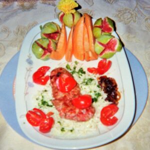 Settembre 28, 2015 RICETTE DI CUCINA articoli 400 admin LE RICETTE DI CASA MIA CENTOSETTANTUNESIMA PARTE 28/09/2015 IN CUCINA CON AMORE E CON FEDERICA FEDERICA La cellulite è ereditaria? ELENA No, la cellulite non è ereditaria ma la tendenza sì; è ereditario un certo stile di vita che va dalle abitudini alimentari sbagliate, alla mancanza di moto, alla mancanza di esercizio fisico, allo schema di tensione e di stress, ecc. La cellulite è insidiosa e avanza lentamente quando un corpo viene maltrattato con cattive abitudini. Che cosa si può fare per guarire? Si inizia dalla dieta con eliminazione appropriata; con la respirazione e ossigenazione; ginnastica mirata; massaggi; relax. È importante tenere presente che tutte le parti dell’organismo sono strettamente collegate, trascurarne anche solo una significa alterare in misura più o meno grave, l’equilibrio dell’organismo. Sarebbe bene moderare quei cibi sofisticati e raffinati che giungono sulla nostra tavola privi delle principali proprietà nutritive. Preferiamo cibi che abbiano un alto valore nutritivo preferendoli a quelli più comodi e già pronti. FEDERICA La carne è inclusa nella dieta anticellulite? ELENA Certo! Scegliere sempre carni magre ad eccezione di qualche volta, ogni molto tempo quella che crediamo più gustosa. Eccoti un piatto di fine estate: tartare di manzo giovane in salsa. TARTARE DI MANZO GIOVANE IN SALSA IN UN LETTO DI RISO PILAF Ingredienti: una bistecca macinata, cipolle rosa,cerfoglio, rafano, basilico, aglio, pomodori, melone, fichi olio extra vergine d’oliva, aceto di agrumi, vinaigrette. Esecuzione: cuocere il riso nella maniera pilaf, tritate la carne nel tritacarne, mescolarla con la vinaigrette, lasciarla riposare tre ore prima di comporla e impiattarla. Mantecare la cipolla rosa tagliare fichi, melone e pomodori impiattare il riso con sopra la tartare ben condita. FEDERICA Non mi è mai piaciuta la tartare, ma così saporita e ben fatta ho incominciato ad apprezzarla. A domani? Buona serata! 30/09/2015 ELENA Raccogliamo gli ultimi sapori dell’estate, che metteremo insieme a un piatto di pesce misto di mare e pesce di lago, ottimo piatto per mantenere una dieta sana. TROTA SALMONATA CON BOCCONCINI DI S. PIETRO IN SALSA DI ERBE ORIENTALI CON NOTE AGRUMATE Ingredienti: trota salmonata, S. Pietro, insalata verde, asparagi, coriandolo, zenzero, cumino, macis, agrumi misti, zucchine, fiori di zucca, ribes, fagioli borlotti, olio extra vergine d’oliva, una noce di burro fresco, pangrattato, olio per frittura, sale, aceto di vino bianco, foglie di aglio. Esecuzione: laviamo bene i pesci, li sfilettiamo e li metteremo a cuocere in forno. A cottura avvenuta, li condiremo in due modi diversi, la trota andrà condita con succo di agrumi, e succo di ribes bianco, zenzero, coriandolo, macis, e olio di oliva. Il S. Pietro dopo averlo pulito dalle lische va condito con una noce di burro, una nota di aceto, olio, erba di aglio, cumino e sale q.b. Poi metteremo in frittura i fiori di zucca, devono essere belli croccanti e sodi. Abbiamo sbollentato gli asparagi e fatto lo stracotto con i borlotti, impanato le zucchine e passate al forno, ora non ci resta che passare al tegame gli asparagi con una nota di olio e una manciatina di parmigiano. Il piatto è pronto, eccolo nella foto sopra! FEDERICA Si vede che scoppia di salute! Non vedo l’ora di scoprire il prossimo! 01/10/2015 ELENA Il piatto che sto per presentare è un filetto di agnello speziato,con soufflé al formaggio e cips di patate in salsa di capperi. FILETTO DI AGNELLO Ingredienti: filetto di agnello, olio extra vergine d’oliva, capperi, dragoncello, scalogno, aceto di mele, salvia, uova, latte, farina, pomodoro, patate, fontina o provola, puntarelle, latte, brodo, spezie miste liofilizzate, ribes bianco. Esecuzione: disossiamo il filetto,lo mettiamo in salsa di aceto, olio, dragoncello, salvia, nel frattempo facciamo il soufflé con i tuorli, il formaggio grattugiato, le patate sbucciate e passate nello schiacciapatate, il latte e le spezie miste, una punta di pomodoro, una manciata di farina per ultimo montiamo gli albumi, mettiamo il composto negli stampini e in forno per 15 minuti a 170°. Adesso facciamo la salsa, con olio, succo di ribes bianco, capperi, e puntarelle sbollentate e passate in padella con un filo di burro. Peliamo le patate crude per le chips e per ultimo facciamo saltare in padella il filetto di agnello, lo rosoliamo per bene, aggiungiamo un mestolo piccolo di brodo, le erbe tagliate fini e lasciamo cuocere a puntino; teniamo da parte il sugo di cottura. Adesso impiattiamo e per ultimo versiamo qualche cucchiaiata di sugo del filetto. Il piatto è pronto! FEDERICA Che piatto raffinato! Bellissimo! 02/10/2015 ELENA Oggi ti lascio la ricetta del dolcetto che mi hai chiesto ieri sera: tortina paradiso in crema di banane e arancia. TORTINA PARADISO AVVOLTA NELLE CREME FEDERICA Oggi ho voglia di chiaccherare, mi stavo domandando il perché una persona che odia tanto la gente sia devota alla … pronunciare questa parola sento ancora molta timidezza ” Madonna”! Spiegami com’ è possibile, grazie! ELENA Non crederai che io sappia tutto! Qui mi trovi molto ma molto insicura nel senso che se penso alla parola ” devozione”, bisogna vedere fino a che punto quella persona sia devota: è il dentro che conta, non il fuori, e poi c’è gente che ancora non sa che cosa significhi religione quella vera! Quindi lascia stare! L’odio viene dalle persone brutte dentro, e fuori fanno il bello e cattivo tempo. Sai cosa ti dico: con tanta gente che conosci proprio di quella ti devi interessare? Lasciala al suo destino! Tanto non le farai mai capire ciò che è giusto e soprattutto ciò non vuol capire! Non voglio più sentir parlare di gente che odia per nulla al mondo! Mi piace il positivo! E adesso alla ricetta, via, via in cucina! Ingredienti: tre uova e un tuorlo, 250 g di fecola, 50 g di farina ” 00″ 250 g di zucchero se