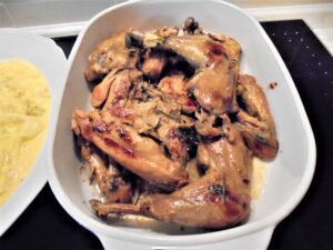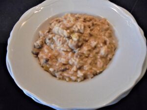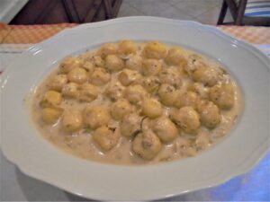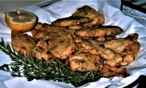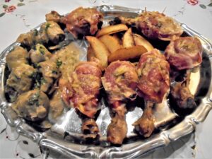 Febbraio 21, 2023 RICETTE DI CUCINA articoli 400 admin LE RICETTE DI CASA MIA TRECENTOSESSANTADUESIMA PARTE 21/02/2023 IN CUCINA CON AMORE E CON FEDERICA Elena Oggi è martedì grasso, quindi presento un piatto di carne, molto gustoso e saporito. eccolo nella foto in basso. FUSI DI POLLO SAPORITI Ingredienti: fusi di pollo, coppa stagionata, rosmarino, salvia, aglio, timo, alloro, ginseng radice macinata, cardamomo, cannella, boldo, olio extra vergine d’oliva, vino rosato, brodo di carne, sale, pepe, peperoncino, agrumi misti. Cuori di carciofi, panco, scalogno, parmigiano reggiano, aceto di mele. Patate al forno con olio, sale e pepe. Esecuzione: togliamo la pelle dai fusi di pollo, li mettiamo a marinare con rosmarino, aglio, olio, salvia, sale, pepe e succo di agrumi. Poi li facciamo rosolare in una casseruola senza alcun grasso. Adesso li copriamo con delle fette di coppa e la teniamo ferma con uno stecchino, poi li mettiamo in padella a rosolare di nuovo, li spruzziamo col vino e li copriamo con erbe e spezie, aggiustiamo di sale pepe e peperoncino, un mestolo abbondante di brodo; li lasciamo cuocere per 40 minuti con il coperchio. Intanto facciamo i cuori di carciofi in umido, con erbe tritate, panco, parmigiano, aceto, sale e pepe, un giro di olio e un mestolo di brodo. Ora peliamo le patate, le tagliamo a spicchi o come volete, poi le saliamo e pepiamo, e le irroriamo con due giri di olio. Quando le patate saranno pronte impiatteremo il tutto e buona cena! Federica Sì, proprio buona cena! 22/02/2023 Elena Oggi presento i tortelloni di magro, la parola “magro”non significza che non siano buoni come gli altri, anzi sono molto di più. Nel condimento dei tortelloni di magro, non ci andrebbe la pancetta grigliata, ma io l’ho messa ugualmente, vorrà dire che faremo l’ennesimo peccato di gola. TORTELLONI DI MAGRO NUOVI Ingredienti: 500 g di castagne secche ammollate, aceto di mele, rosmarino, uvetta 40 g, sale, pepe, tre etti di ricotta di pecora, parmigiano reggiano, due uova, farina per pasta fresca, piselli, olio extra vergine d’oliva, basilico fresco, tabasco, pancetta faccoltativa. Esecuzione: dopo aver messo le castagne in ammollo per una notte, il giorno successivo le dobbiamo lessare con un po’ di sale, un bicchierino di aceto e rosmarino. Le maciniamo e aggiungiamo al composto sale, pepe, uvetta ammollata e strizzata, ricotta setacciata, parmigiano. Adesso ci occuperemo della pasta fresca: impastiamo e la lasciamo riposare per 15 minuti, poi la tiriamo sottile e mettiamo il ripieno con il sacco a poche, formiamo dei ravioli ben sigillati. Intanto che l’acqua si scalderà, facciamo il condimento con olio, sale, pepe, piselli lessati, un filo di latte. Ora caliamo i ravioli in acqua salata, li mantechiamo nella padella del condimento, e spolverizziamo con del parmigiano aggiungendo qualche dadino di pancetta grigliata; quest’ultima sarebbe faccoltativa, perché i miei ravioli di magro non prevedono la pancetta nel condimento. Federica Buoni da urlo! 23/02/2023 Elena Oggi ripropongo la frittura in pastella alle erbe. Si può usare il pesce, le bistecche tenere di vitello o scamone, oppure delle verdure miste spadellate e poi condite con panco, mozzarella e parmigiano. Buonissime! FRITTO MISTO IN PASTELLA Ingredienti: verdure miste, panco, parmigiano reggiano, filetti di pesce, bistecchine di scamone o di vitello, agrumi, rosmarino, origano, sale, pepe, acqua frizzante, olio extre v. d’oliva, farina tipo “0”, sale, olio per friggere. Esecuzione: prepariamo i felitti di pesce, in un’altro recipiente mettiamo quelli di carne, li saliamo, li pepiamo e mettiamo il tutto a marinare nel succo di agrumi misti. Prepariamo le verdure: peperoni, patate, zucchine, melanzane, con un filo d’olio le spadelliamo fino a portarle a metà cottura, poi le condiamo con il parmigiano e le assembliamo col panco fino a formare una polpetta piatta. Adesso portiamo l’olio a temperatura, intanto asciughiamo i filetti, li immergiamo nella pastella, poi sulla carta assorbente, infine pastelliamo anche le piattelle di verdure, le friggiamo e le serviremo insieme con limone e rosmarino. (Nella pastella ho messo: sale, pepe, spezie, origano e rosmarino). Federica Me lo ricordo bene questo fritto! Meraviglioso! Croccante, asciutto e saporito. 24/02/2023 Elena Molte sono le cose buone che vengono da lontano, di tanto tempo fa, come ad esempio questo risotto con le patate e tutti i sapori di una volta. RISOTTO ANTICO DI NONNA Ingredienti: brodo di carne, riso per risotti, uno spicchio di aglio grande, prezzemolo, una crosta di parmigiano, parmigiano reggiano, un uovo, mezzo bicchierino di latte, due chiodi di garofano, una patata grande, sale. Esecuzione: facciamo un brodo di carne, poi in quello che ci serve ci cuoceremo una patata tagliata a pezzetti, uno spicchio di aglio, una crosta di parmigiano e due chiodi di garofano. Caliamo il riso mentre il brodo sta bollendo, quando sarà a cottura al dente aggiungeremo il composto di uova, parmigiano, latte e prezzemolo, lo mantechiamo e lo giriamo più volte, infine lo serviremo e spolverizziamo ancora con un po’ di parmigiano. Federica Una bontà assicurata! C’è la sapidità con il sapore del brodo di carne, poi si sente il gusto del parmigiano (la crosta bollita) il prezzemolo e la crema di uovo, latte e parmigiano reggiano, che insieme alla cremosità della patata danno un valore al risotto, sia come gusto che come aspetto. 26/02/2023 Elena Qualche mese fa ho creato questa torta per Federica, lei l’ha servita come dessert nel suo ristorante, ora ve la presento. TORTA NUOVA DELLE FESTE Ingredienti: pasta sfoglia fresca caramellata da ambo le parti, pan di spagna, crema al caffè, 500 g di panna montata, 400 g di zucchero semolato, cioccolato fondente al 50% 300 g, crema all’arancia, meringa. Per il pan di Spagna abbiamo usato 5 uova intere, 350 g di farina, estratto di vaniglia, 250 g di zucchero, un cucchiaino di lievito pe
