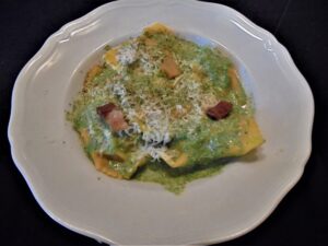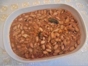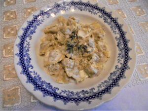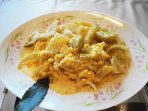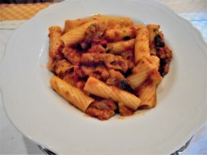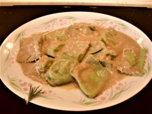 Febbraio 28, 2023 RICETTE DI CUCINA articoli 400 admin LE RICETTE DI CASA MIA TRECENTOSESSANTATREESIMA PARTE 28/02/2023 IN CUCINA CON AMORE E CON FEDERICA Elena Iniziamo l’articolo con un altro piatto di ravioli, ovviamente sempre nuovi; questi che presentiamo oggi sono al broccolo romano, gorgonzola, e ricotta di capra. Hanno un gusto particolare e buonissimo. RAVIOLI AL CAVOLO ROMANO GORGONZOLA E RICOTTA DI CAPRA Ingredienti: due uova, farina o semola per pasta fresca, colorante di spinaci, sale, pepe. Per ilripieno: cavolo romano, gorgonzola, ricotta di capre, parmigiano reggiano, pepe, tabasco, rosmarino, funghi porcini, scalogno, olio extra vergine d’oliva, brodo. Esecuzione: incominciamo con il puLire e cuocere il cavolo, poi lo tagliamo a piccoli pezzetti, lo mettiamo in una terrina con la ricotta e il gorgonzola, il parmigiano, sale, pepe, tabasco. Amalgamiamo bene il tutto e lasciamo riposare. Intanto impastiamo uova, farine e sale, lasciamo riposare l’impasto per 30 minuti e nel frattempo faremo il condimento: trifoliamo i porcini con olio, sale, pepe, scalogno; poi metteremo tutto nel mixer e frulliamo, se risulterà troppo liquido aggiungiamo olio se fosse il contrario, metteremo il brodo. Adesso in 5 minuti tiriamo la sfoglia e mettiamo il ripieno nei ravioli, li copriamo e li taglieremo quasi tutti uguali; l’acqua bolle, mettiamo il sale, caliamo i ravioli, li scoliamo e li adageremo nella casseruola del ripieno. Mantechiamo e aggiungiamo una manciata di parmigiano. Federica Buonissimi! Di una particolarità buonissima! 01/03/2023 Elena In una giornata fredda come questa un piatto caldo è quello che ci vuole, ad esempio la trippa coi fagioli fatta il giorno prima; un piatto buono saporito e avvolgente. FAGIOLI E TRIPPA Ingredienti: brodo vegetale, trippa, aceto forte di vino bianco, fagioli borlotti, conserva di pomodoro fatta in casa, vino rosso, sedano prezzemolo, carote, scalogni 2, origano, nepetella, alloro, basilico, noce moscata o macis, sale, pepe, un peperoncino, olio extra vergine d’oliva, rosmarino. Esecuzione: laviamo bene la trippa, la tagliamo a striscioline, poi la mettiamo in ammollo con acqua e aceto forte. Nel frattempo facciamo cuocere i fagioli, con rosmarino e poco sale. Adesso cambiamo acqua e aceto alla trippa e la facciamo bollire per un’ora. Intanto facciamo un trito di verdure: scalogni, sedano, carote, erbe aromatiche tutte quelle elencate sopra, poi scoliamo la trippa e facciamo rosolare le verdure tritate in poco olio, aggiungiamo la trippa, la sfumiamo col vino, aggiungiamo le erbe e spezie, la conserva di pomodoro, il brodo e lasciamo cuocere per altre due ore (meglio se si ha la stufa a legna) piano piano in modo che si cuocia bene. Quando la trippa avrà raggiunto la giusta consistenza, sarà quasi cotta, caliamo i fagioli e li lasciamo amalgamare bollendo ancora un po’ piano piano per circa venti minuti; dopo di che la trippa sarebbe pronta da gustare, meglio se mangiata il giorno seguente. Federica A me la trippa fatta con i fagioli o i ceci come fai tu la mangerei anche d’estate. 02/03/2023 Elena Oggi invece presenteremo due contorni: finocchi in tritura e melanzane al forno. Entrambi questi piatti sono buonissimi. MELANZANE AL FORNO E FINOCCHI IN TRITURA FINOCCHI IN TRITURA Ingredienti: finocchi, melanzane, origano, latte, crescenza, aglio fresco, un uovo, parmigiano reggiano, noce moscata, olio extra vergine d’oliva, sale, pepe, rosmarino. Esecuzione: s’incomincia dalle melanzane perchè devono restare sotto sale per un’ora. Si lavano bene, si asciugano e si tagliano in linea orizzontale creando delle fette spesse due cm circa. Si stendono sopra a un’asse di legno, si salano e si lasciano riposare per un’ora. Nel frattempo laviamo e tagliamo i finocchi, li adagiamo in una casseruola con noce moscata, sale, pepe, un ciuffo di rosmarino, latte; si mettono a cuocere a fuoco basso pe 10 minuti circa o affinché avremo trovato la giusta cottura. Una volta spento il fuoco, li lasciamo leggermente intiepidire, intanto facciamo la tritura sbattendo un uovo, un pizzico di sale, e quattro cucchiai di parmigiano grattugiato; mescoliamo bene il tutto a crema, poi lo verseremo dentro la casseruola dei finocchi, allungando la crema con un poco di brodo, mescoliamo bene e i finocchi sono pronti da servire. Ora torniamo alle melanzane, le squotiamo dall’acqua di vegetazione, le spennelliamo con l’olio, le pepiamo, e le cuoceremo 10 minuti in forno a 180° . Un volta tolte dal forno spalmiamo sopra le melanzane un trito di aglio e di origano freschi, infine mentre sono ancora calde ci metteremo sopra anche una cucchiaiata di crescenza. Serviamo ancora calde. Federica Buoni questi due contorni, sfiziosi. 03/03/2023 Elena Era molto tempo che non cucinavo i rigatoni con l’anatra, li ho fatti ancora più buoni. RIGATONI ALL’ANATRA Ingredienti: rigatoni, petto di anatra, malvasia, sale, pepe, tabasco, conserva di pomodoro fatta in casa, scalogno, rosmarino, timo, aglio, salvia, ginepro, cumino, oli extra vergine d’oliva, parmigiano reggiano, basilico. Esecuzione: incominciamo col cucinare il petto d’anatra, facendolo rosolare dalla parte dove ho lasciato un velo di pelle, lo rosoliamo da ambo le parti. Sfumiamo con la malvasia poi mettiamo due spicchi di aglio, la salvia, rosmarino, il cumino, sale, pepe, un po’ di tabasco e un po’ di brodo. Lasciamo cuocere per un’ora a calore moderato, lasciamo intiepidire la carne e poi la tagliamo a strisce larghe un cm e ricaviamo dei cubettini di un cm per uno circa. Intanto abbiamo fatto bollire il ragù di pomodoro con il ginepro, e il basilico, ora amalgamiamo bene i cubetti di anatra al sugo, infine versiamo qualche giro di olio. Caliamo la pasta, la scoleremo al dente e la verseremo nella casseruola del ragù, mantechiamo bene e a fuoco spento mettiamo un bel giro di parmigiano. E il piatto è pronto da servire. Federica Che buono! Si sentiva il profumo del ragù fino a
