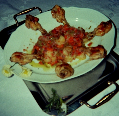 Esecuzione: lavare , la carne, spogliarli della pelle e del grasso.  Ora li mettiamo in farcia con pepe, peperoncino,  un pizzico di sale e vino bianco secco. Intanto puliamo le verdure, le tagliamo a pezzettini, le mettiamo in casseruola con il chiodo di garofano, l’alloro, salvia, basilico, sale,  il vino bianco e un poco di brodo. A cottura ultimata cospargeremo sulle verdure un cucchiaino di parmigiano, prezzemolo tritato,  un poco di olio e versiamo il tutto nel centro del piatto da portata. Adesso è la volta del pollo che andremo a rosolare con salvia, un spicchio d’aglio,  dragoncello, peperoncino, sale e pepe. Finita la doratura faremo iniziare la cottura con il vino bianco, a fine cottura lo doriamo ancora senza grassi ma useremo quel poco che ne sarà uscito. Impiattare la carne, vedi nella foto sopra!